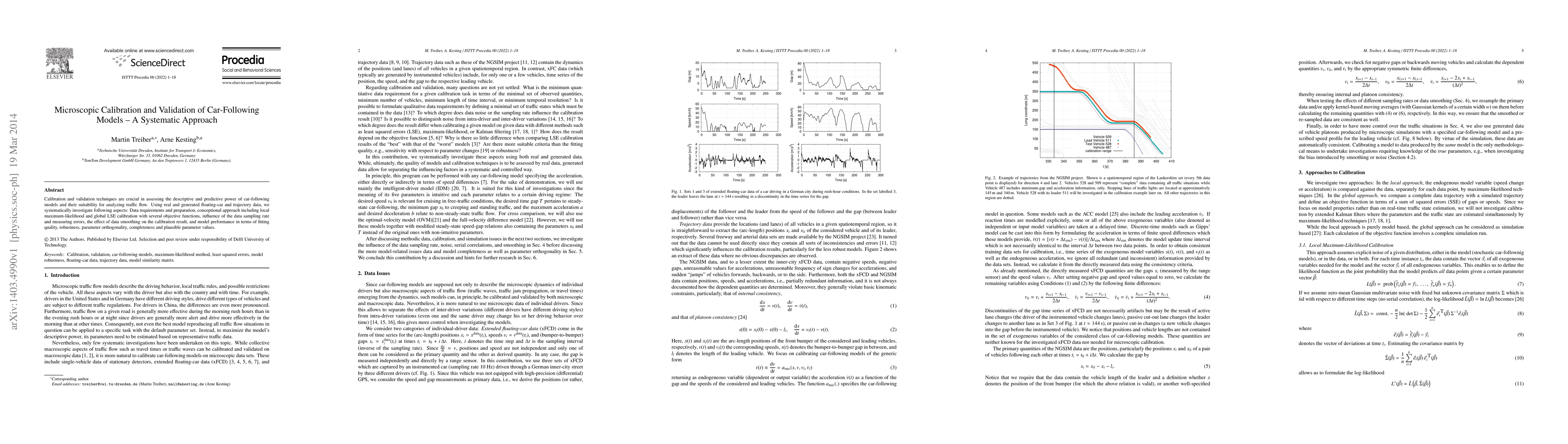 Calibration and validation techniques are crucial in assessing the descriptive and predictive power of car-following models and their suitability for analyzing traffic flow. Using real and generated floating-car and trajectory data, we systematically investigate following aspects: Data requirements and preparation, conceptional approach including local maximum-likelihood and global LSE calibration with several objective functions, influence of the data sampling rate and measuring errors, the effect of data smoothing on the calibration result, and model performance in terms of fitting quality, robustness, parameter orthogonality, completeness and plausible parameter values.