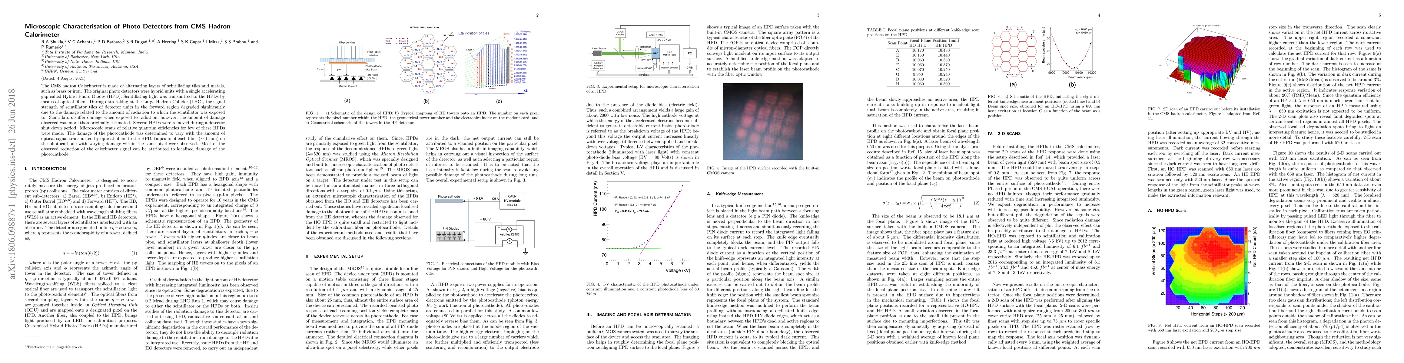 The CMS hadron Calorimeter is made of alternating layers of scintillating tiles and metals, such as brass or iron. The original photo detectors were hybrid units with a single accelerating gap called Hybrid Photo Diodes (HPD). Scintillating light was transmitted to the HPDs by means of optical fibers. During data taking at the Large Hadron Collider (LHC), the signal strength of scintillator tiles of detector units in the forward region degraded significantly due to the damage related to the amount of radiation to which the scintillator was exposed to. Scintillators suffer damage when exposed to radiation, however, the amount of damage observed was more than originally estimated. Several HPDs were removed during a detector shut down period. Microscopic scans of relative quantum efficiencies for few of these HPDs were made. The damage of the photocathode was determined to vary with the amount of optical signal transmitted by optical fibers to the HPD. Imprints of each fiber (1 mm) on the photocathode with varying damage within the same pixel were observed. Most of the observed reduction of the calorimeter signal can be attributed to localised damage of the photocathode.