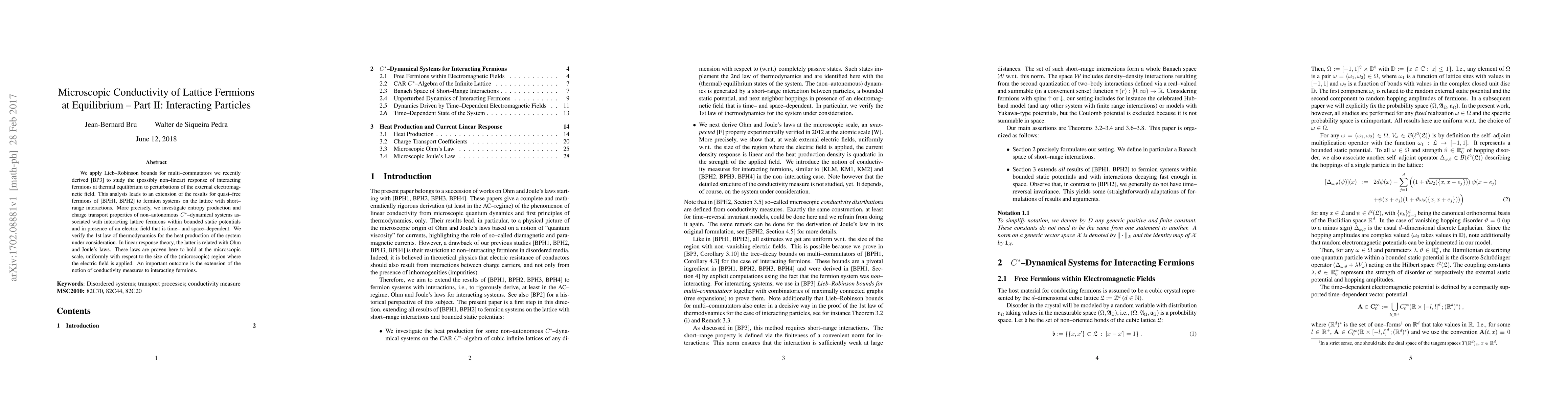 We apply Lieb-Robinson bounds for multi-commutators we recently derived to study the (possibly non-linear) response of interacting fermions at thermal equilibrium to perturbations of the external electromagnetic field. This analysis leads to an extension of the results for quasi-free fermions of \cite{OhmI,OhmII} to fermion systems on the lattice with short-range interactions. More precisely, we investigate entropy production and charge transport properties of non-autonomous $C^{\ast }$-dynamical systems associated with interacting lattice fermions within bounded static potentials and in presence of an electric field that is time- and space-dependent. We verify the 1st law of thermodynamics for the heat production of the system under consideration. In linear response theory, the latter is related with Ohm and Joule's laws. These laws are proven here to hold at the microscopic scale, uniformly with respect to the size of the (microscopic) region where the electric field is applied. An important outcome is the extension of the notion of conductivity measures to interacting fermions.