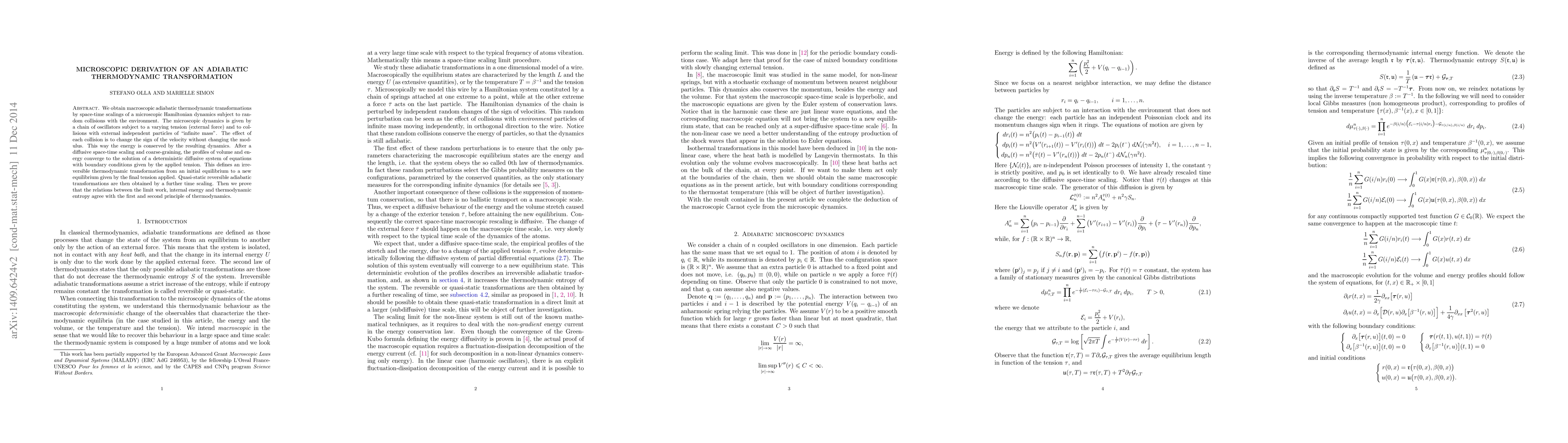 Researchers develop a method to derive adiabatic thermodynamic transformations from microscopic Hamiltonian dynamics under random collisions with the environment. The process involves scaling space-time and applying a final tension change, resulting in irreversible transformations that match first and second principles of thermodynamics.