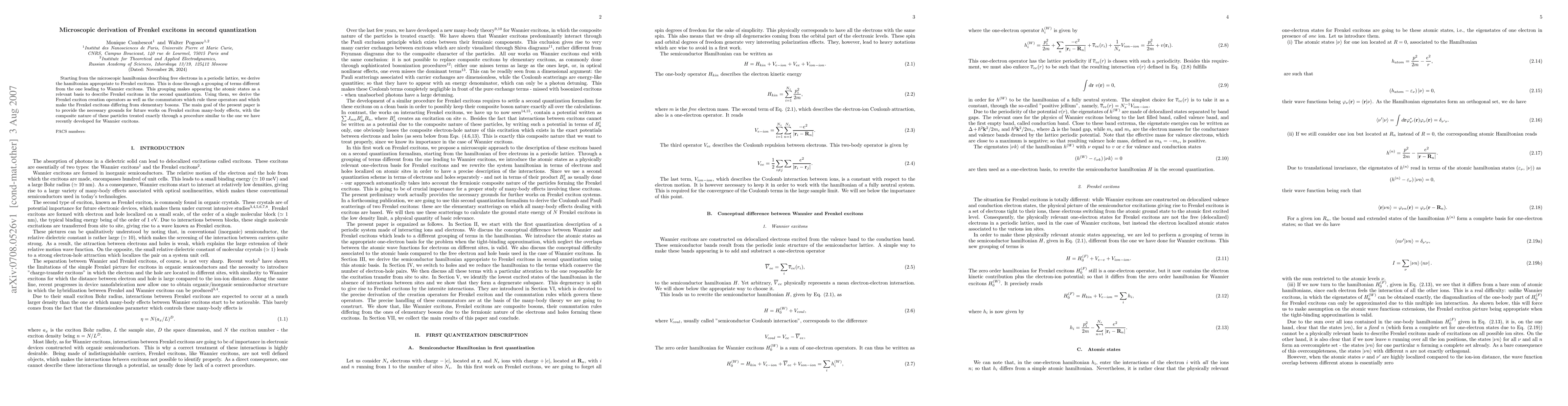 This research derives the Hamiltonian for Frenkel excitons from the microscopic Hamiltonian of free electrons in a periodic lattice, distinguishing it from the Wannier exciton derivation. It introduces atomic states as a basis for second quantization, establishing Frenkel exciton creation operators and their unique commutators, setting the stage for future many-body studies of these composite particles.
