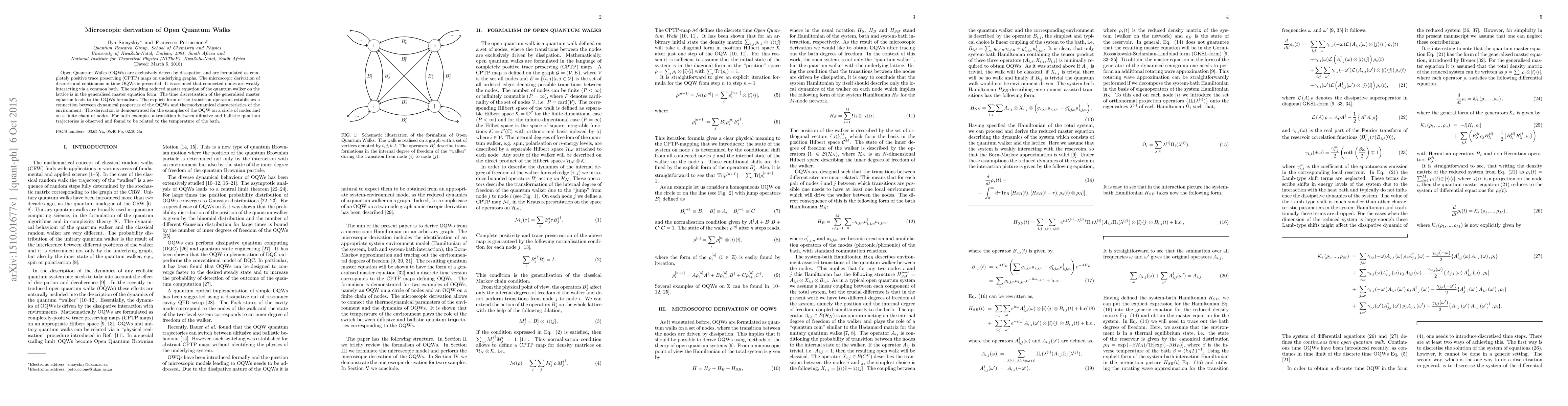 This paper derives the microscopic foundations of Open Quantum Walks (OQWs) through completely positive trace preserving maps on graphs, driven by dissipation. The derivation connects the dynamical properties of OQWs to the thermodynamic characteristics of the environment, demonstrating transitions between diffusive and ballistic quantum trajectories influenced by the bath temperature.