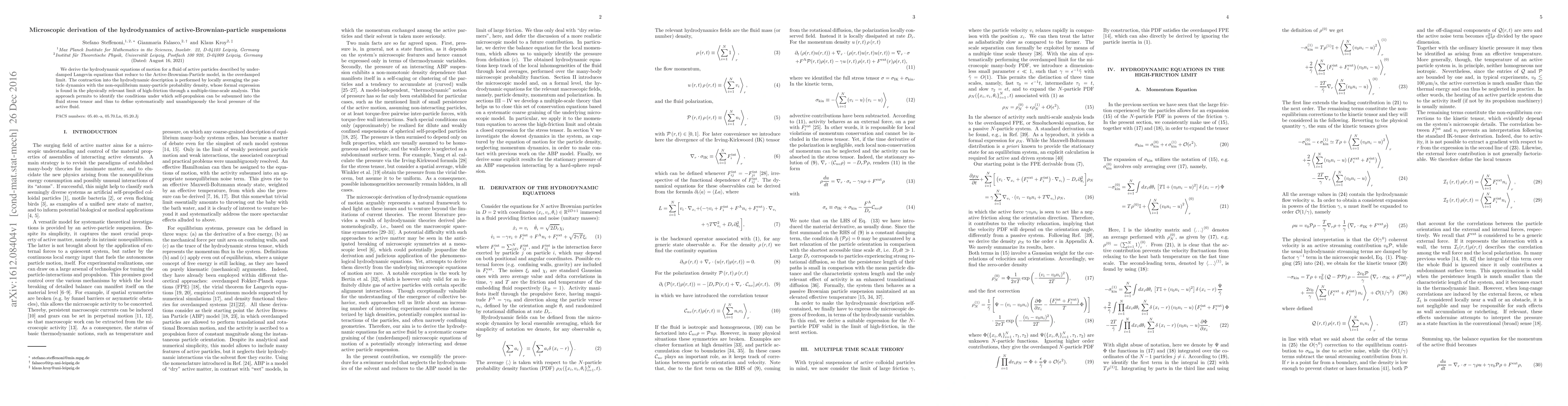 This paper derives hydrodynamic equations for active-Brownian-particle suspensions by averaging particle dynamics with a non-equilibrium many-particle probability density, identifying conditions for self-propulsion to contribute to the fluid stress tensor and defining local pressure in the active fluid.