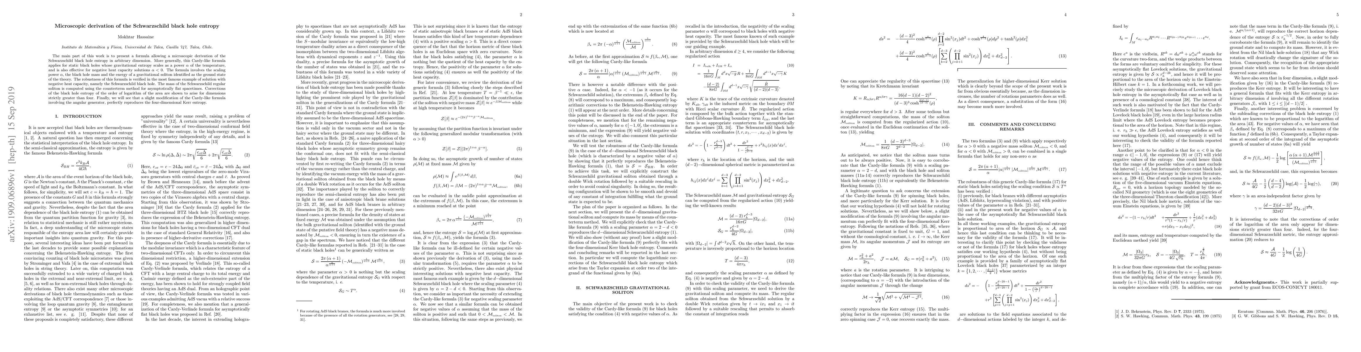 The main part of this work is to present a formula allowing a microscopic derivation of the Schwarzschild black hole entropy in arbitrary dimension. More generally, this Cardy-like formula applies for static black holes whose gravitational entropy scales as a power of the temperature, and is also effective for negative heat capacity solutions. The formula involves the scaling power, the black hole mass and the energy of a gravitational soliton identified as the ground state of the theory. The robustness of this formula is verified in the most famous example of solution with negative heat capacity, namely the Schwarzschild black hole. The mass of the Schwarzschild regular soliton is computed using the counterterm method for asymptotically flat spacetimes. Corrections of the black hole entropy of the order of logarithm of the area are shown to arise for dimensions strictly greater than four. Finally, we will see that a slight modification of the Cardy-like formula involving the angular generator, perfectly reproduces the four-dimensional Kerr entropy.
