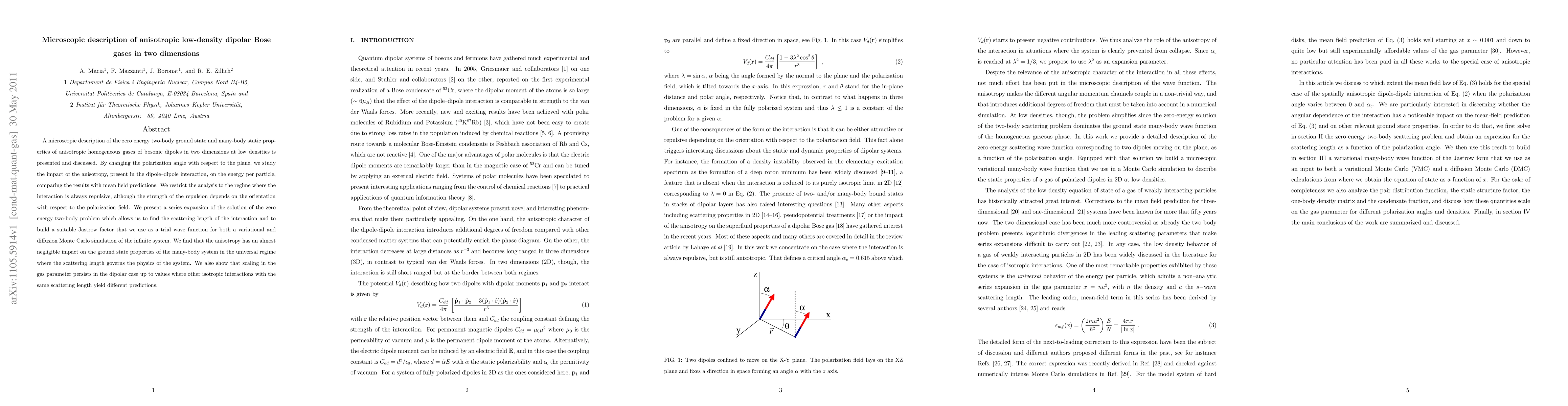 A microscopic description of the zero energy two-body ground state and many-body static properties of anisotropic homogeneous gases of bosonic dipoles in two dimensions at low densities is presented and discussed. By changing the polarization angle with respect to the plane, we study the impact of the anisotropy, present in the dipole--dipole interaction, on the energy per particle, comparing the results with mean field predictions. We restrict the analysis to the regime where the interaction is always repulsive, although the strength of the repulsion depends on the orientation with respect to the polarization field. We present a series expansion of the solution of the zero energy two-body problem which allows us to find the scattering length of the interaction and to build a suitable Jastrow factor that we use as a trial wave function for both a variational and diffusion Monte Carlo simulation of the infinite system. We find that the anisotropy has an almost negligible impact on the ground state properties of the many-body system in the universal regime where the scattering length governs the physics of the system. We also show that scaling in the gas parameter persists in the dipolar case up to values where other isotropic interactions with the same scattering length yield different predictions.
