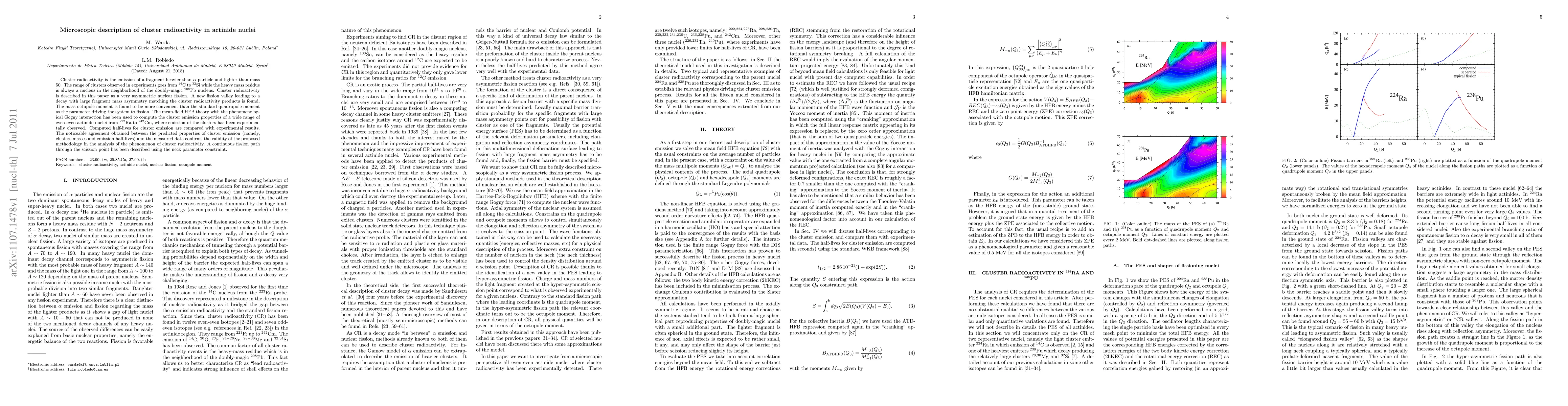 This paper investigates cluster radioactivity in actinide nuclei, describing it as an asymmetric nuclear fission leading to fragments heavier than alpha particles but lighter than mass 50. The study uses mean-field HFB theory with the Gogny interaction to compute cluster emission properties and finds a good agreement between predicted and experimental half-lives, confirming the methodology's validity.