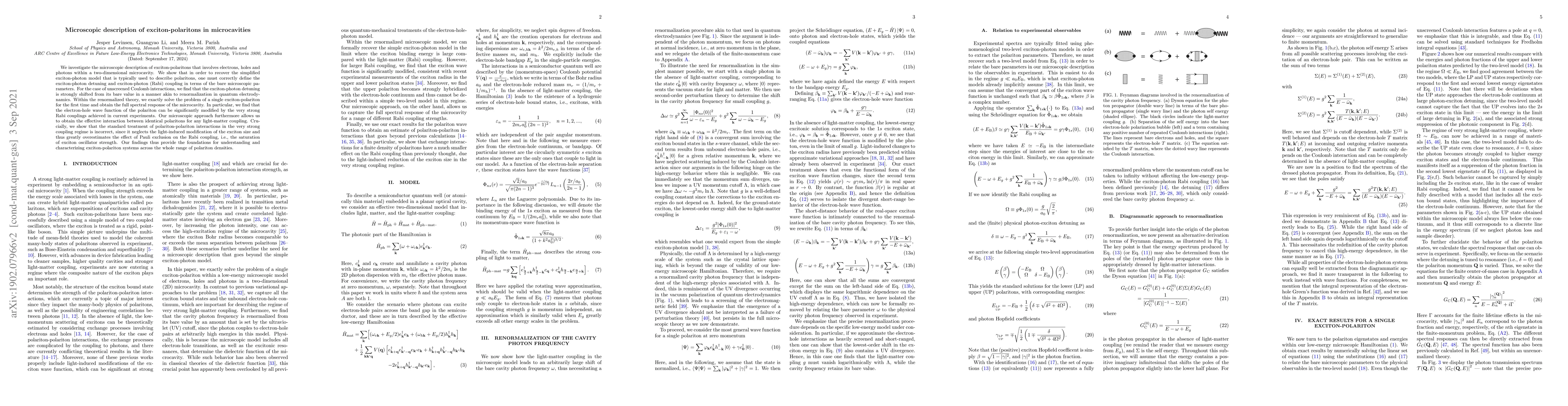 We investigate the microscopic description of exciton-polaritons that involves electrons, holes and photons within a two-dimensional microcavity. We show that in order to recover the simplified exciton-photon model that is typically used to describe polaritons, one must correctly define the exciton-photon detuning and exciton-photon (Rabi) coupling in terms of the bare microscopic parameters. For the case of unscreened Coulomb interactions, we find that the exciton-photon detuning is strongly shifted from its bare value in a manner akin to renormalization in quantum electrodynamics. Within the renormalized theory, we exactly solve the problem of a single exciton-polariton for the first time and obtain the full spectral response of the microcavity. In particular, we find that the electron-hole wave function of the polariton can be significantly modified by the very strong Rabi couplings achieved in current experiments. Our microscopic approach furthermore allows us to obtain the effective interaction between identical polaritons for any light-matter coupling. Crucially, we show that the standard treatment of polariton-polariton interactions in the very strong coupling regime is incorrect, since it neglects the light-induced modification of the exciton size and thus greatly overestimates the effect of Pauli exclusion on the Rabi coupling, i.e., the saturation of exciton oscillator strength. Our findings thus provide the foundations for understanding and characterizing exciton-polariton systems across the whole range of polariton densities.