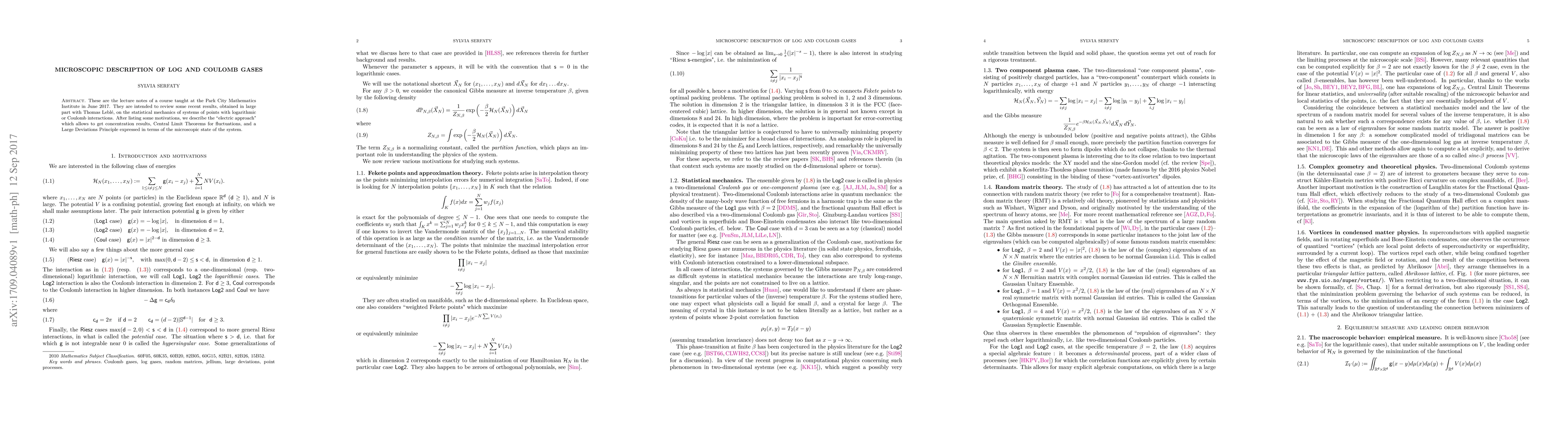 These are the lecture notes of a course taught at the Park City Mathematics Institute in June 2017. They are intended to review some recent results, obtained in large part with Thomas Lebl\'e, on the statistical mechanics of systems of points with logarithmic or Coulomb interactions. After listing some motivations, we describe the "electric approach" which allows to get concentration results, Central Limit Theorems for fluctuations, and a Large Deviations Principle expressed in terms of the microscopic state of the system.