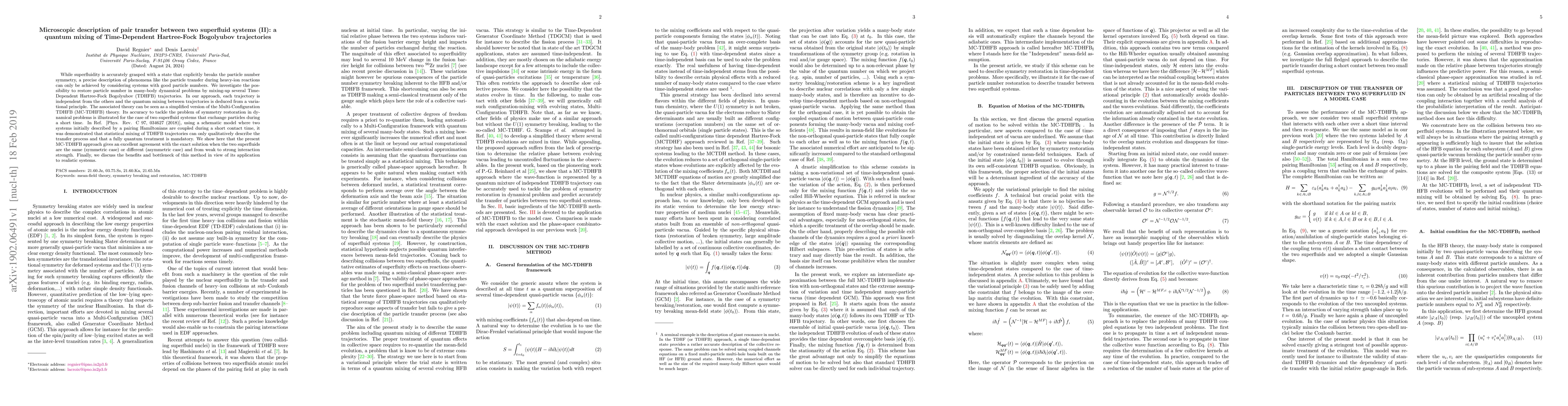 The research employs a Multi-Configuration Time-Dependent Hartree-Fock Bogolyubov (MC-TDHFB) approach to describe particle transfer between two superfluid systems, mixing independent TDHFB trajectories via a quantum process derived from a variational principle.