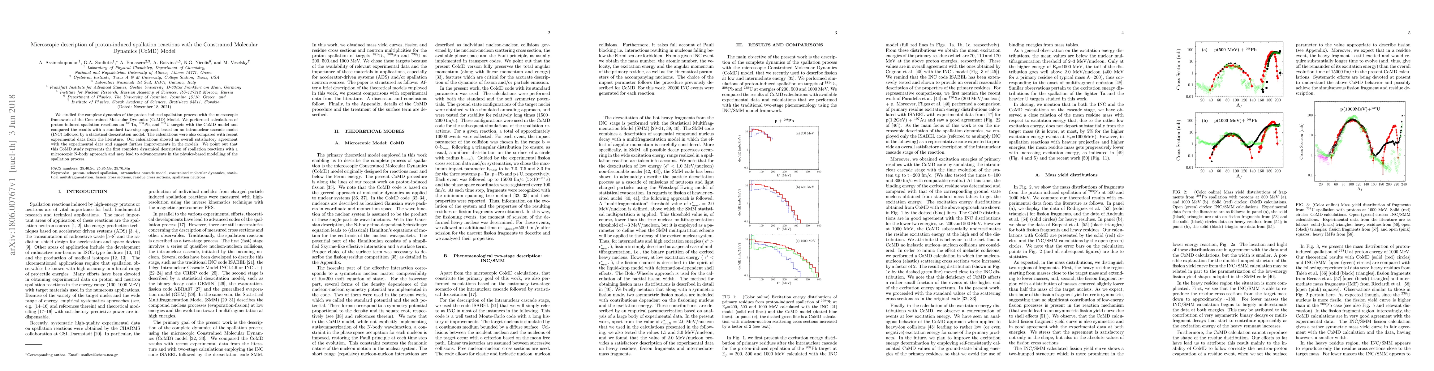 This paper uses the Constrained Molecular Dynamics (CoMD) model to study proton-induced spallation reactions on Ta, Pb, and U targets, providing a microscopic N-body approach. The results show satisfactory agreement with experimental data and suggest improvements in modelling the spallation process.