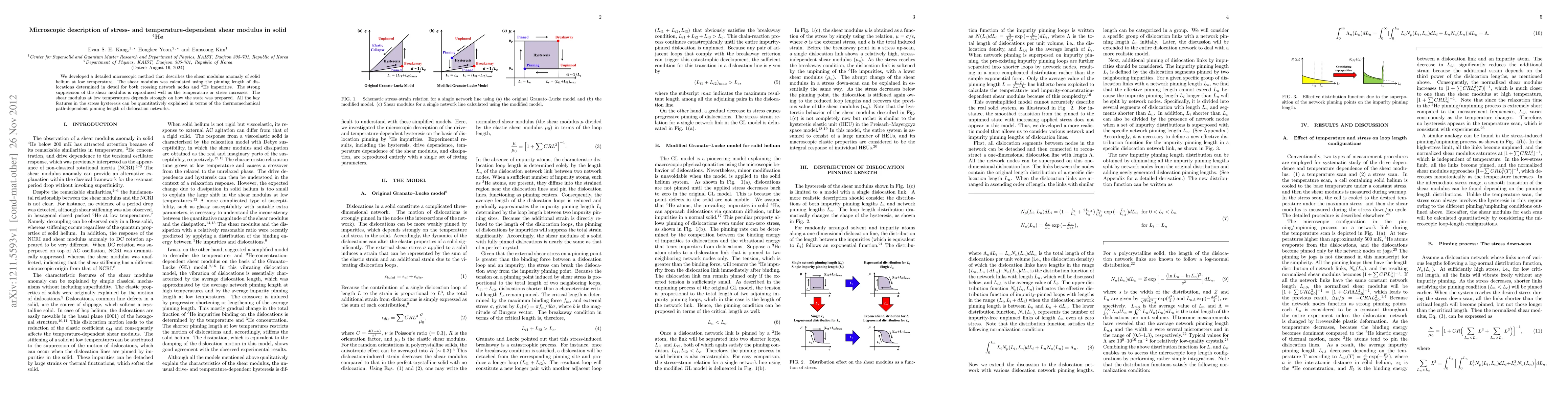 This paper presents a microscopic method to describe the shear modulus anomaly in solid helium, focusing on its temperature and stress dependencies. The method accurately reproduces the shear modulus suppression and explains stress hysteresis through detailed dislocation pinning length analysis involving network nodes and 3He impurities.