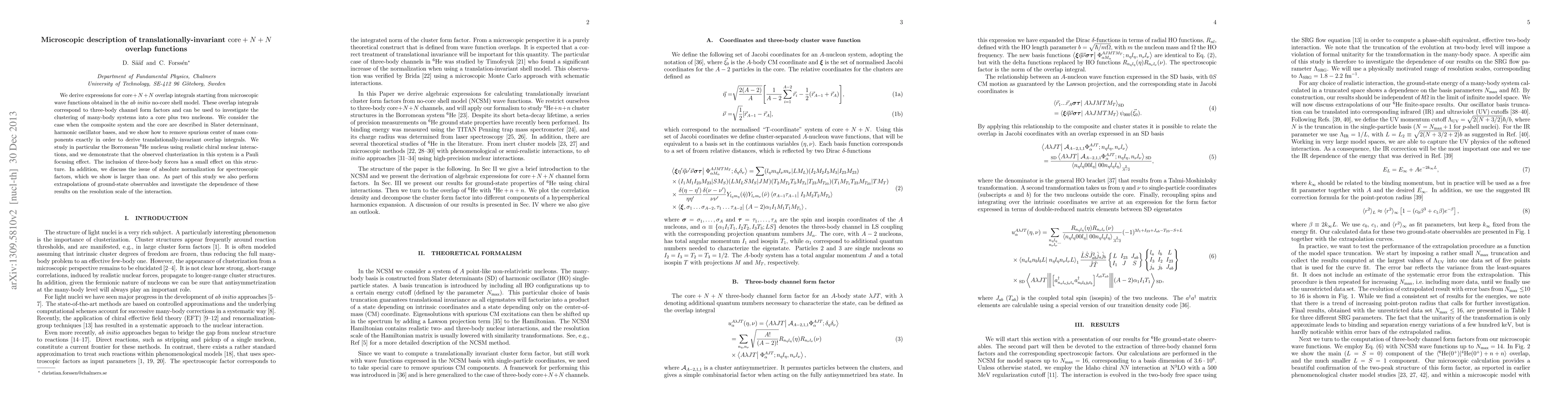We derive expressions for core + N + N overlap integrals starting from microscopic wave functions obtained in the ab initio no-core shell model. These overlap integrals correspond to three-body channel form factors and can be used to investigate the clustering of many-body systems into a core plus two nucleons. We consider the case when the composite system and the core are described in Slater determinant, harmonic oscillator bases, and we show how to remove spurious center of mass components exactly in order to derive translationally-invariant overlap integrals. We study in particular the Borromean 6He nucleus using realistic chiral nuclear interactions, and we demonstrate that the observed clusterization in this system is a Pauli focusing effect. The inclusion of three-body forces has a small effect on this structure. In addition, we discuss the issue of absolute normalization for spectroscopic factors, which we show is larger than one. As part of this study we also perform extrapolations of ground-state observables and investigate the dependence of these results on the resolution scale of the interaction.