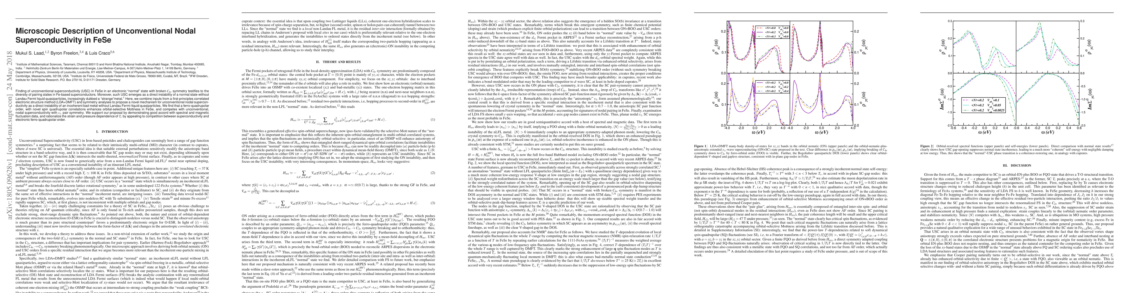 This paper proposes a novel mechanism for unconventional nodal superconductivity in FeSe, suggesting it arises from a direct instability of a "strange" metal state without Landau Fermi liquid quasiparticles. The study combines first-principles methods and symmetry analyses to argue that ferro-quadrupolar order and spin quadrupolar correlations enhance orbital-selective Mottness, competing with $s_{\pm}$-pair symmetry superconductivity.