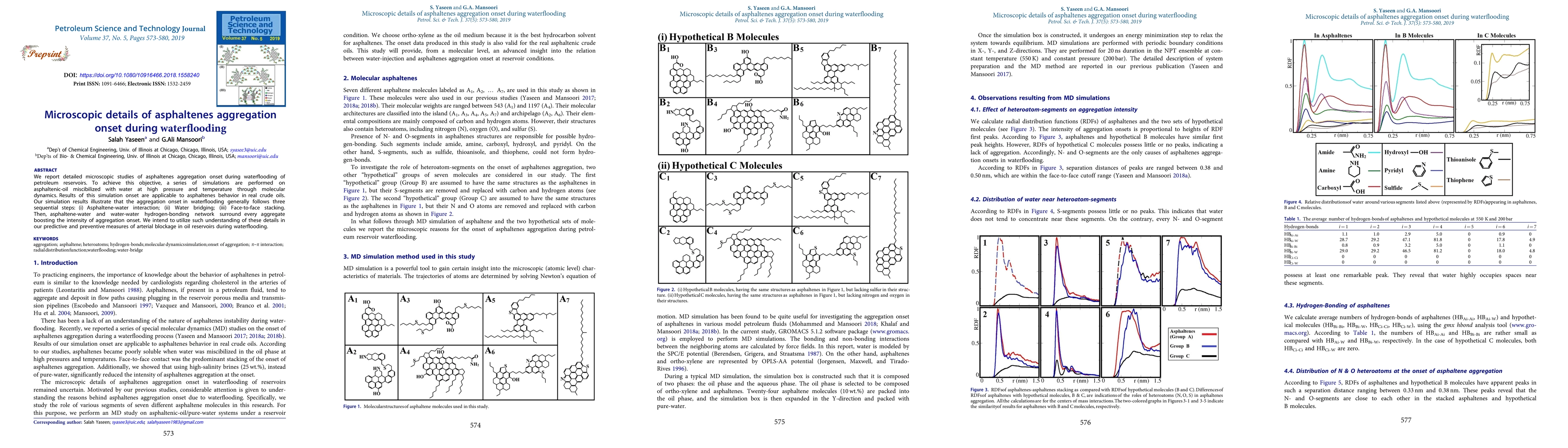 This study uses molecular dynamics simulations to reveal three sequential steps of asphaltenes aggregation onset during waterflooding in petroleum reservoirs: asphaltene-water interaction, water bridging, and face-to-face stacking. The findings aim to improve predictive and preventive measures against arterial blockage in oil reservoirs.