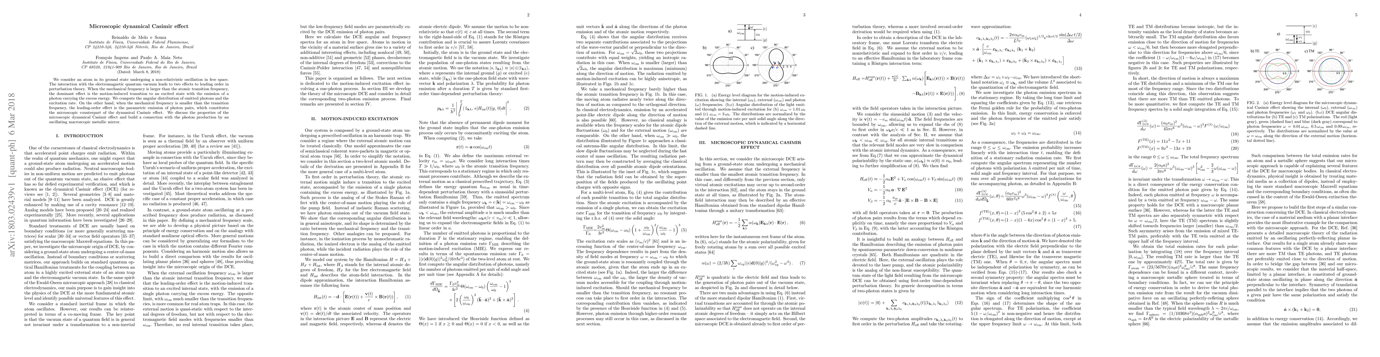 This paper investigates the microscopic dynamical Casimir effect where an oscillating atom in free space interacts with the electromagnetic quantum vacuum, leading to either photon emission or pair production depending on the frequency of oscillation relative to the atomic transition frequency. The study computes the angular distribution and excitation rate for photon emission and explores the parametric emission of photon pairs, linking it to macroscopic mirror-induced photon production.