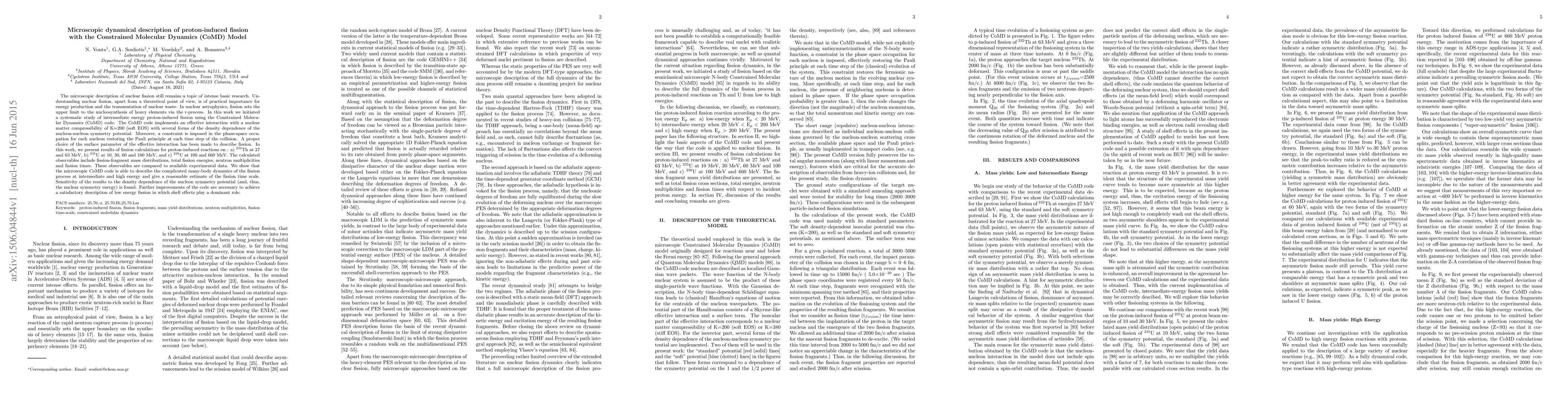 The microscopic description of nuclear fission still remains a topic of intense basic research. Un- derstanding nuclear fission, apart from a theoretical point of view, is of practical importance for energy production and the transmutation of nuclear waste. In nuclear astrophysics, fission sets the upper limit to the nucleosynthesis of heavy elements via the r-process. In this work we initiated a systematic study of intermediate energy proton-induced fission using the Constrained Molecu- lar Dynamics (CoMD) code. The CoMD code implements an effective interaction with a nuclear matter compressibility of K=200 (soft EOS) with several forms of the density dependence of the nucleon-nucleon symmetry potential. Moreover, a constraint is imposed in the phase-space occu- pation for each nucleon restoring the Pauli principle at each time step of the collision. A proper choice of the surface parameter of the effective interaction has been made to describe fission. In this work, we present results of fission calculations for proton-induced reactions on : a) 232 Th at 27 and 63 MeV, b) 235 U at 10, 30, 60 and 100 MeV, and c) 238 U at 100 and 660 MeV. The calculated observables include fission-fragment mass distributions, total fission energies, neutron multiplicities and fission times. These observables are compared to available experimental data. We show that the microscopic CoMD code is able to describe the complicated many-body dynamics of the fission process at intermediate and high energy and give a reasonable estimate of the fission time scale. Sensitivity of the results to the density dependence of the nucleon symmetry potential (and, thus, the nuclear symmetry energy) is found. Further improvements of the code are necessary to achieve a satisfactory description of low energy fission in which shell effects play a dominant role.