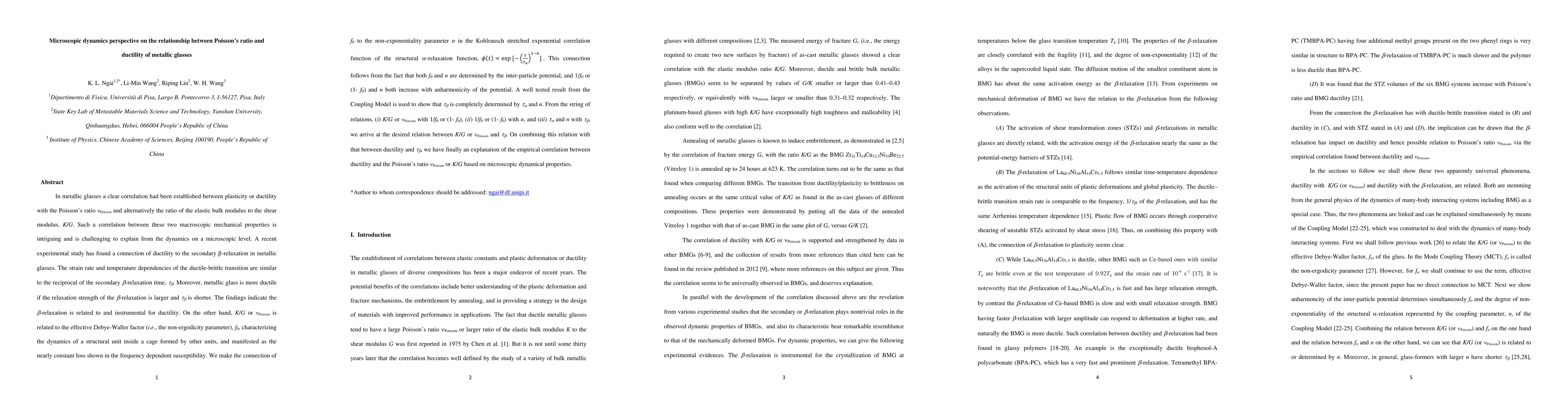 This paper explores the microscopic dynamics underlying the correlation between Poisson ratio and ductility in metallic glasses, offering a new microscopic explanation for the established macroscopic relationship between plasticity and the ratio of elastic bulk modulus to shear modulus.