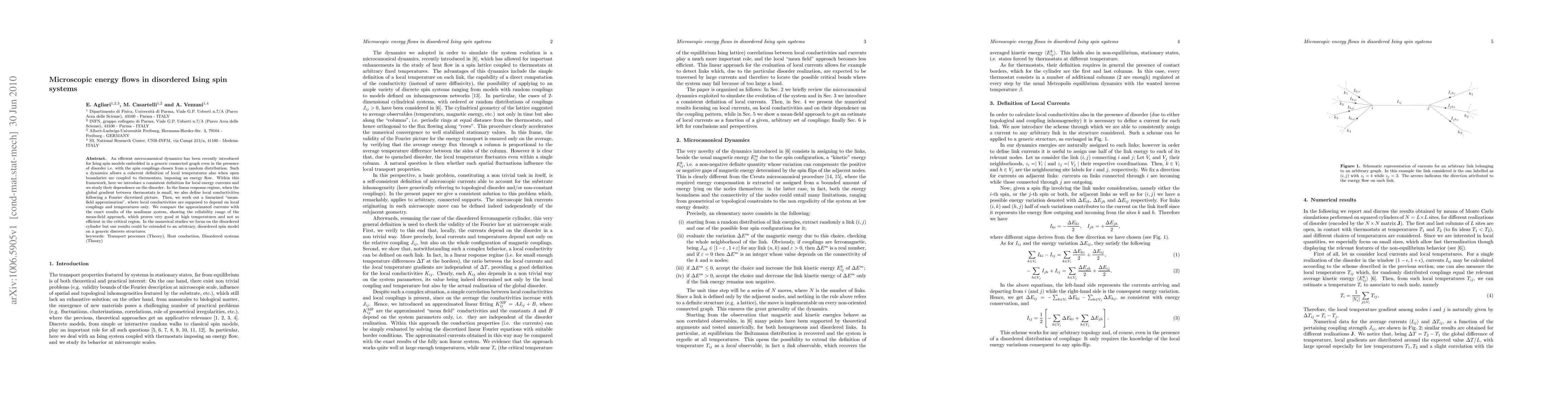 An efficient microcanonical dynamics has been recently introduced for Ising spin models embedded in a generic connected graph even in the presence of disorder i.e. with the spin couplings chosen from a random distribution. Such a dynamics allows a coherent definition of local temperatures also when open boundaries are coupled to thermostats, imposing an energy flow. Within this framework, here we introduce a consistent definition for local energy currents and we study their dependence on the disorder. In the linear response regime, when the global gradient between thermostats is small, we also define local conductivities following a Fourier dicretized picture. Then, we work out a linearized "mean-field approximation", where local conductivities are supposed to depend on local couplings and temperatures only. We compare the approximated currents with the exact results of the nonlinear system, showing the reliability range of the mean-field approach, which proves very good at high temperatures and not so efficient in the critical region. In the numerical studies we focus on the disordered cylinder but our results could be extended to an arbitrary, disordered spin model on a generic discrete structures.