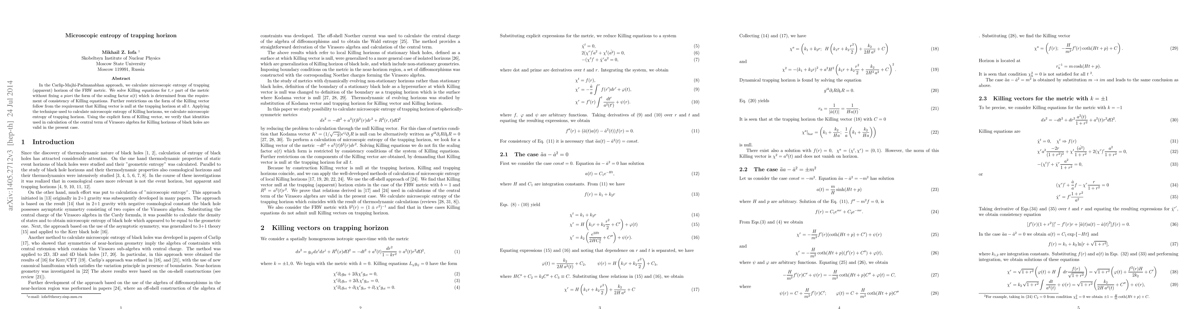 In the Carlip-Majhi-Padmanabhan approach, we calculate microscopic entropy of trapping (apparent) horizon of the FRW metric. We solve Killing equations for $t,r$ part of the metric without fixing {\it a piori} the form of the scaling factor $a(t)$ which is determined from the requirement of consistency of Killing equations. Further restrictions on the form of the Killing vector follow from the requirement that Killing vector is null at the trapping horizon at all $t$. Applying the technique used to calculate microscopic entropy of Killing horizons, we calculate microscopic entropy of trapping horizon. Using the explicit form of Killing vector, we verify that identities used in calculation of the central term of Virasoro algebra for Killing horizons of black holes are valid in the present case.