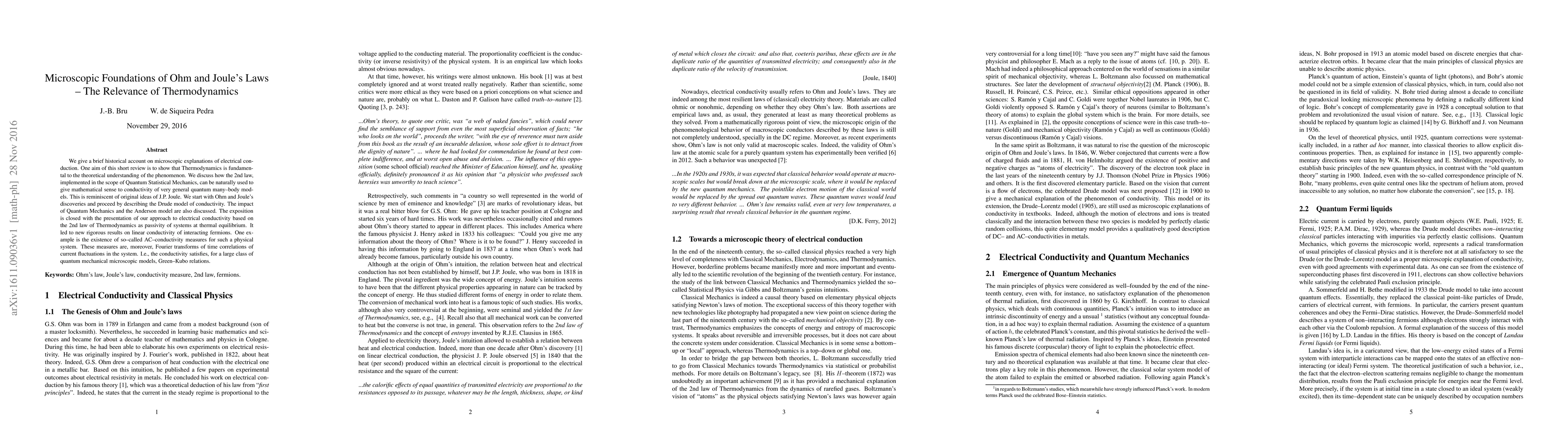 We give a brief historical account on microscopic explanations of electrical conduction. One aim of this short review is to show that Thermodynamics is fundamental to the theoretical understanding of the phenomenon. We discuss how the 2nd law, implemented in the scope of Quantum Statistical Mechanics, can be naturally used to give mathematical sense to conductivity of very general quantum many-body models. This is reminiscent of original ideas of J.P. Joule. We start with Ohm and Joule's discoveries and proceed by describing the Drude model of conductivity. The impact of Quantum Mechanics and the Anderson model are also discussed. The exposition is closed with the presentation of our approach to electrical conductivity based on the 2nd law of Thermodynamics as passivity of systems at thermal equilibrium. It led to new rigorous results on linear conductivity of interacting fermions. One example is the existence of so-called AC-conductivity measures for such a physical system. These measures are, moreover, Fourier transforms of time correlations of current fluctuations in the system. I.e., the conductivity satisfies, for a large class of quantum mechanical microscopic models, Green-Kubo relations.