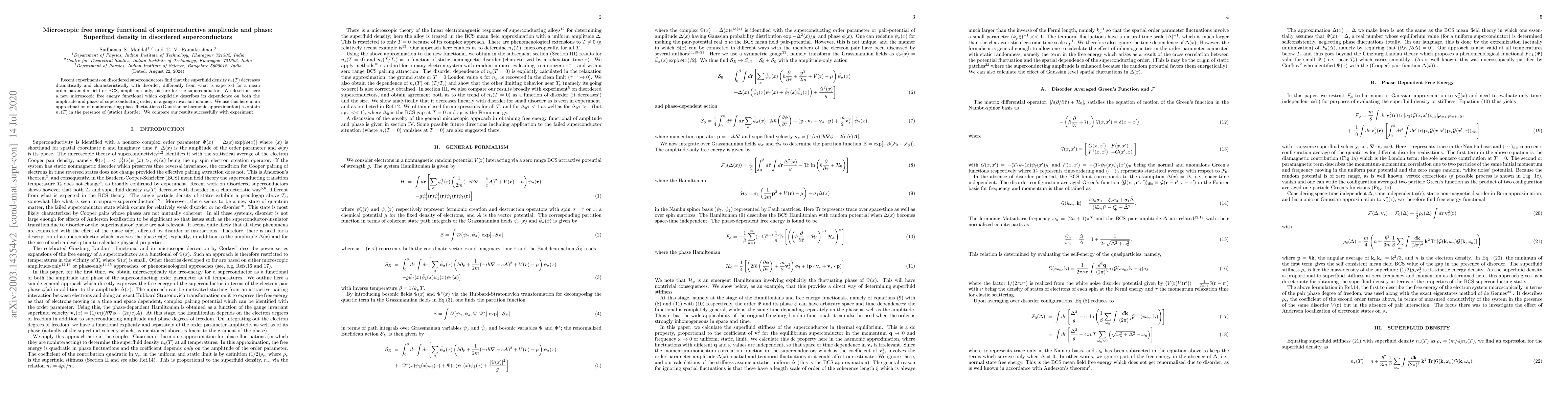 This paper introduces a new microscopic free energy functional that accounts for both the amplitude and phase of the superconducting order parameter, providing a gauge-invariant description. The authors use this functional to calculate the superfluid density $n_s(T)$ in disordered superconductors, showing that it decreases distinctively with disorder, and compare their findings successfully with experimental results.