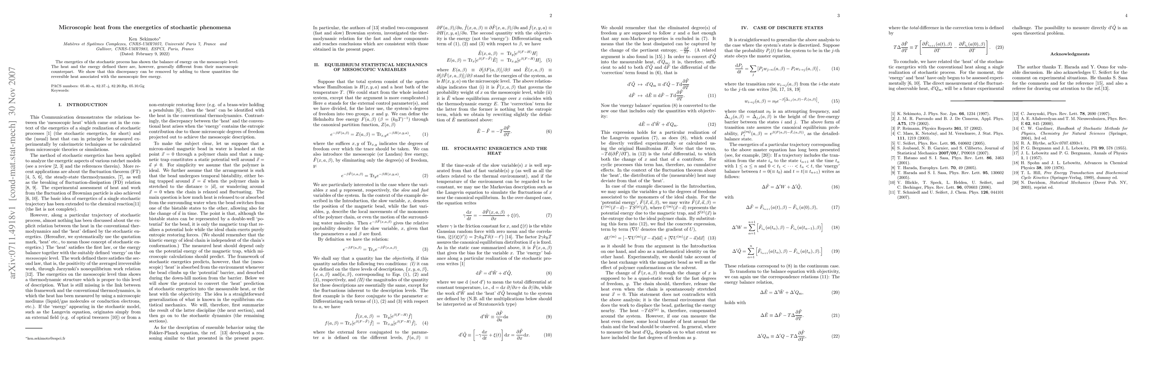 The paper introduces a method to reconcile mesoscopic heat from stochastic energetics with conventional thermodynamic heat, providing a comprehensive framework for understanding energy balance in microscopic systems.