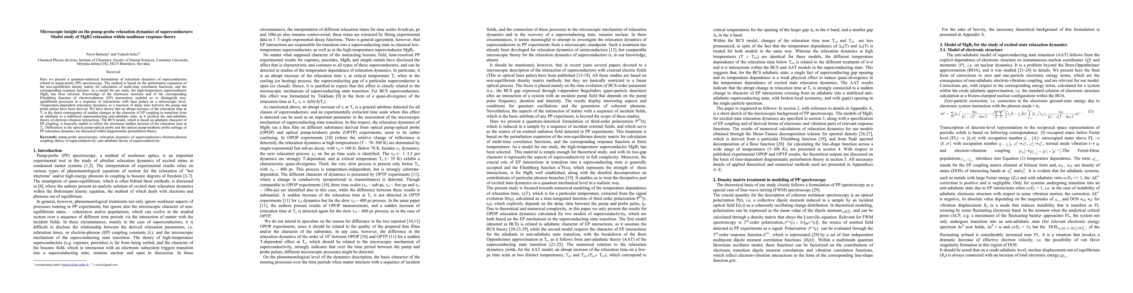 Here we present a quantum-statistical formulation of third-order polarization P(3)(t), which is induced in a sample by a sequence of incident external fields, and serves as a source of an emitted radiation field detected as a signal in pump-probe (PP) experiments. Our treatment is based on the perturbation expansion of the non-equilibrium density matrix for calculation of multi-time correlation functions, and the corresponding response function, at finite temperature. As a model for our study, the high-temperature superconductor MgB2 has been selected. Knowledge of the electronic structure of the studied system, and of the corresponding Eliashberg function that represents pertinent electron-phonon (EP) interactions, enabled us to distinguish non-equilibrium processes running over different time-periods in a sequence of interactions with laser pulses on a microscopic level. We have also derived temperature-dependent relaxation dynamics as a function of delay time between the pump and probe pulses. For the studied model system of MgB2, we have shown that an abrupt increase of the relaxation time at Tc, as detected by experiments, is the direct consequence of sudden changes in the character of EP coupling in transition from an adiabatic to a stabilized superconducting anti-adiabatic state, as it predicts the anti-adiabatic theory of electron-vibration interactions. The BCS model, which preserves the adiabatic character of EP coupling also below the critical temperature of MgB2, is basically unable to reflect the enormous sudden increase of the relaxation time. Based on diagrammatic perturbation theory, differences in the optical pump-optical probe and the optical pump-terahertz probe settings of MgB2 PP relaxation dynamics are discussed.