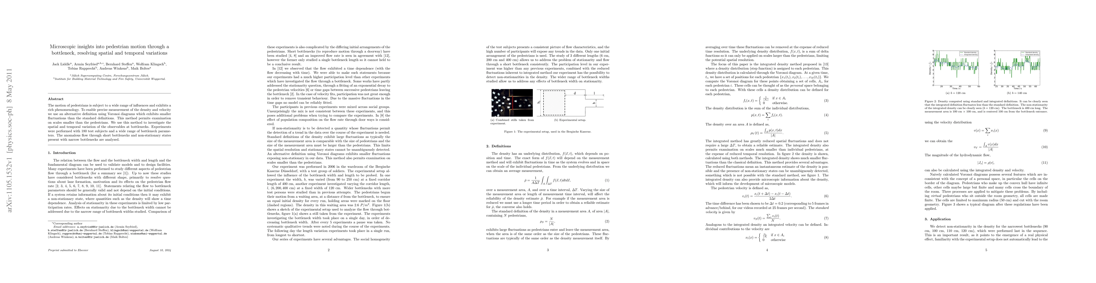 Researchers studied pedestrian motion through bottlenecks using a new method that measures density and velocity with smaller fluctuations than traditional methods. They found anomalous flow in short bottlenecks and non-stationary states, shedding light on the complex dynamics of pedestrian traffic.