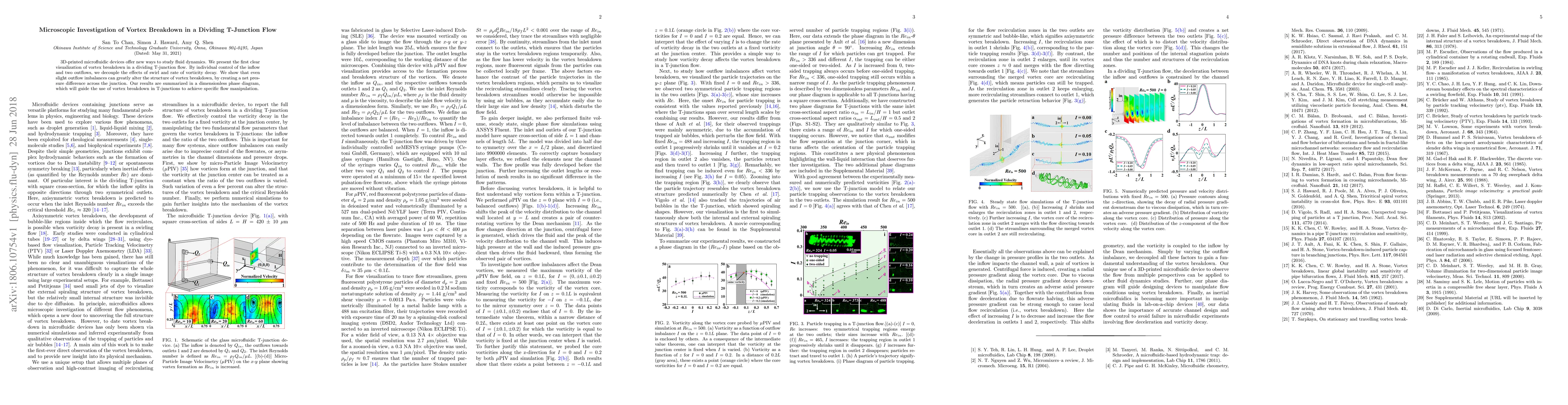 This study utilizes 3D-printed microfluidic devices to visualize vortex breakdown in a dividing T-junction flow, demonstrating how slight outflow imbalances can significantly alter vortex structure due to net pressure differences. The findings are encapsulated in a dimensionless phase diagram to guide future applications of vortex breakdown for targeted flow control.