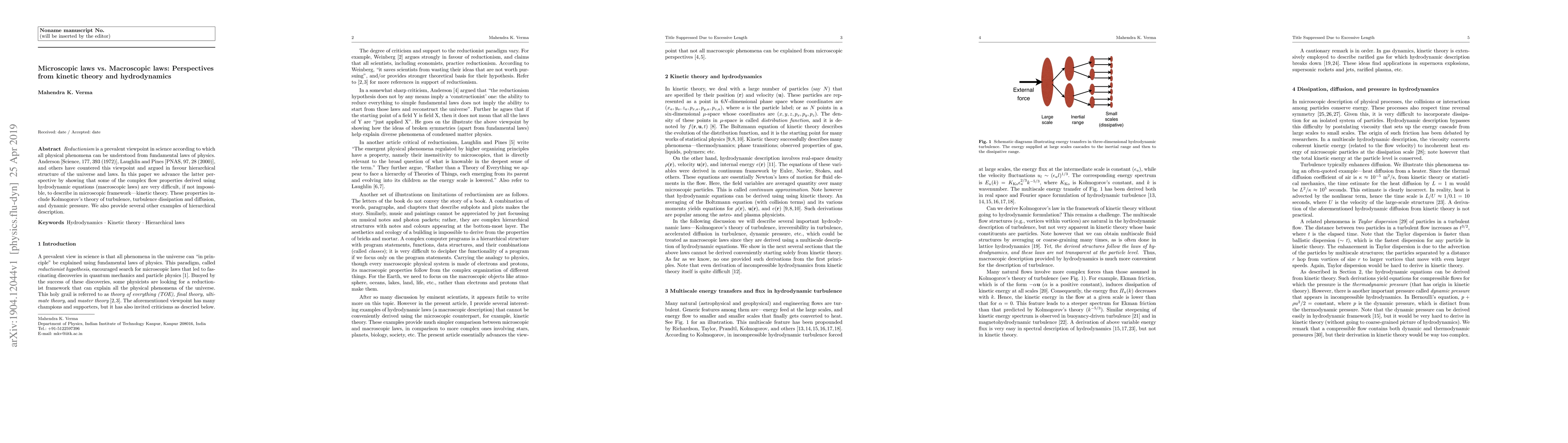 Reductionism is a prevalent viewpoint in science according to which all physical phenomena can be understood from fundamental laws of physics. Anderson [Science, 177, 393 (1972)], Laughlin and Pines [PNAS, 97, 28 (2000)], and others have countered this viewpoint and argued in favour hierarchical structure of the universe and laws. In this paper we advance the latter perspective by showing that some of the complex flow properties derived using hydrodynamic equations (macroscopic laws) are very difficult, if not impossible, to describe in microscopic framework---kinetic theory. These properties include Kolmogorov's theory of turbulence, turbulence dissipation and diffusion, and dynamic pressure. We also provide several other examples of hierarchical description.