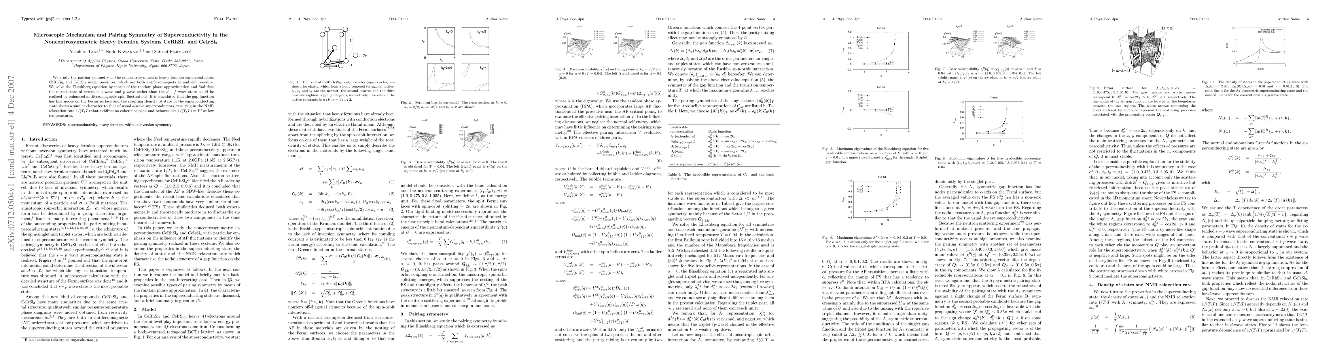 The study investigates superconductivity in noncentrosymmetric heavy fermion systems CeRhSi$_3$ and CeIrSi$_3$ under pressure. Using the random phase approximation, it finds that extended s-wave and p-wave pairing, not $d+f$ wave, is realized due to enhanced antiferromagnetic spin fluctuations. This leads to line nodes on the Fermi surface, a density of states similar to d-wave superconductors, and a NMR relaxation rate $1/(T_1T)$ behaving as $T^2$ at low temperatures.