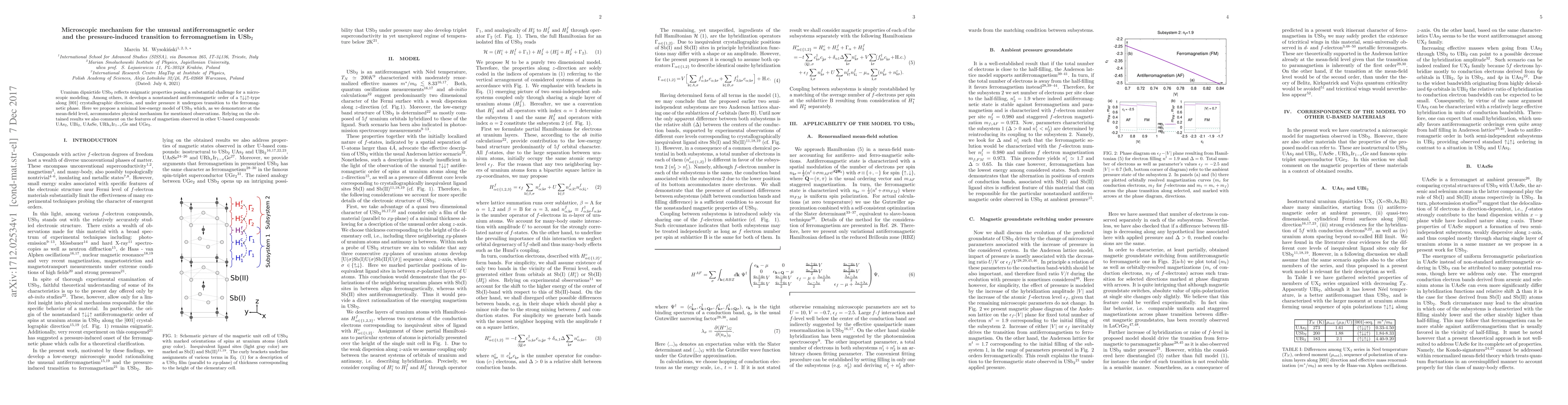 Uranium dipnictide USb$_2$ reflects enigmatic properties posing a substantial challenge for a microscopic modeling. Among others, it develops a nonstandard antiferromagnetic order of a $\uparrow\downarrow\downarrow\uparrow$-type along [001] crystallographic direction, and under pressure it undergoes transition to the ferromagnetic phase. Here we propose a minimal low-energy model of USb$_2$ which, as we demonstrate at the mean-field level, accommodates physical mechanism for mentioned observations. Relying on the obtained results we also comment on the features of magnetism observed in other U-based compounds: UAs$_2$, UBi$_2$, UAsSe, URh$_x$Ir$_{1-x}$Ge and UGe$_2$.