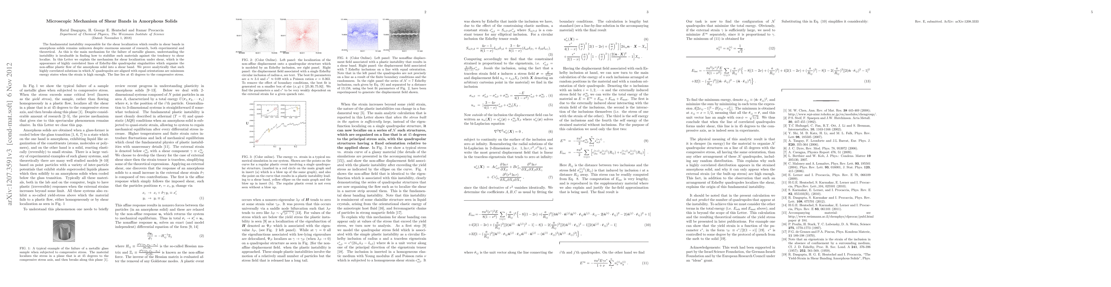 This paper elucidates the microscopic mechanism behind shear localization in amorphous solids, identifying the formation of correlated lines of Eshelby-like quadrupolar singularities as the root cause. The authors demonstrate analytically that these configurations are minimum energy states under high strain, leading to the formation of shear bands at a 45-degree angle to the compressive stress.