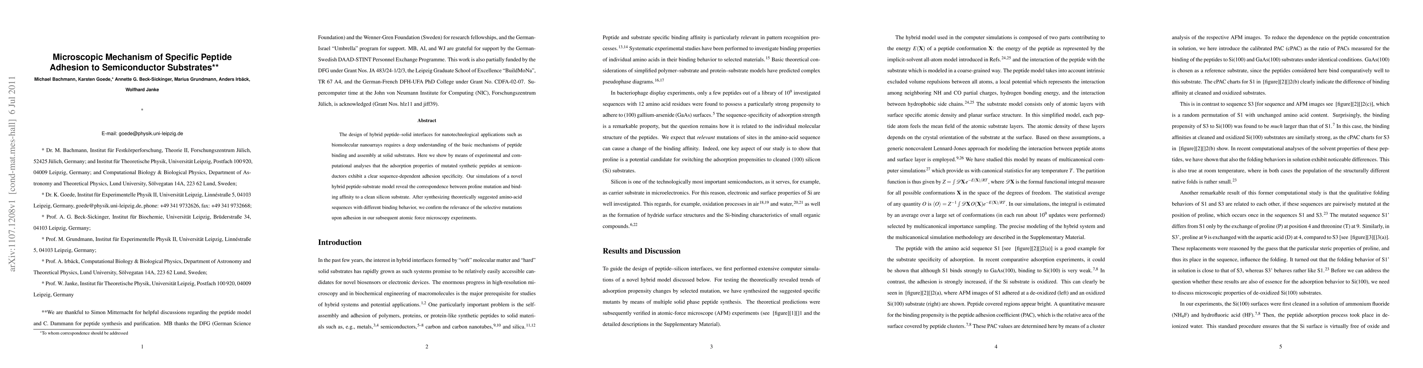 This paper investigates the microscopic mechanisms of peptide adhesion to semiconductor substrates, demonstrating sequence-dependent adhesion specificity through experimental and computational analyses. The study finds that proline mutations enhance binding affinity, confirmed by atomic force microscopy after synthesizing specific amino-acid sequences.