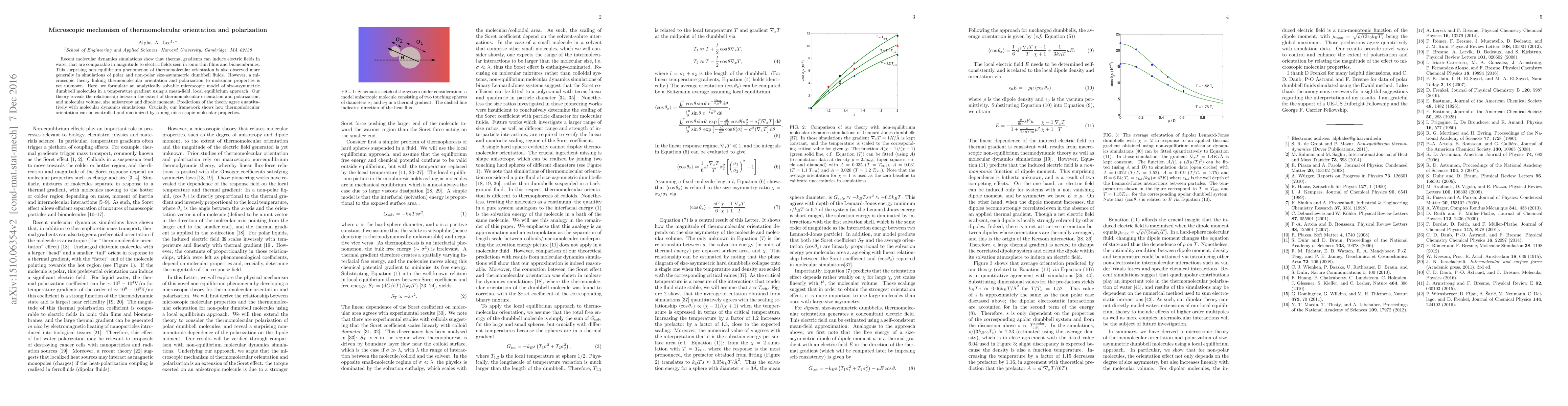Recent molecular dynamics simulations show that thermal gradients can induce electric fields in water that are comparable in magnitude to electric fields seen in ionic thin films and biomembranes. This surprising non-equilibrium phenomenon of thermomolecular orientation is also observed more generally in simulations of polar and non-polar size-asymmetric dumbbell fluids. However, a microscopic theory linking thermomolecular orientation and polarization to molecular properties is yet unknown. Here, we formulate an analytically solvable microscopic model of size-asymmetric dumbbell molecules in a temperature gradient using a mean-field, local equilibrium approach. Our theory reveals the relationship between the extent of thermomolecular orientation and polarization, and molecular volume, size anisotropy and dipole moment. Predictions of the theory agree quantitatively with molecular dynamics simulations. Crucially, our framework shows how thermomolecular orientation can be controlled and maximized by tuning microscopic molecular properties.