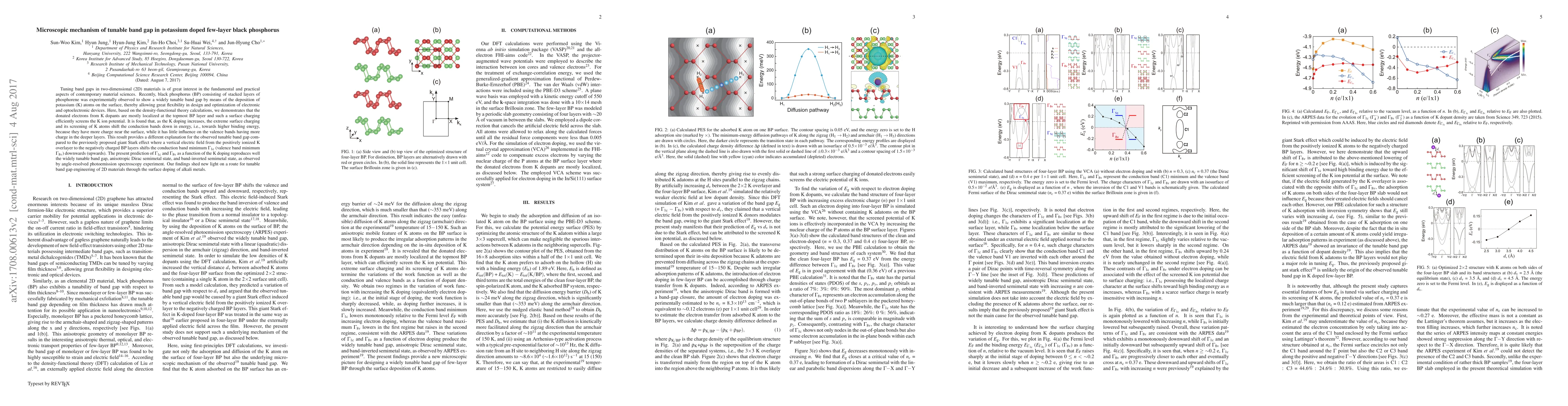 This paper demonstrates that potassium doping in few-layer black phosphorus tunes its band gap through surface charging effects, where donated electrons from K dopants localize at the topmost BP layer, screening the K ion potential and shifting the conduction band down in energy. This provides an alternative explanation for the tunable band gap compared to the giant Stark effect.
