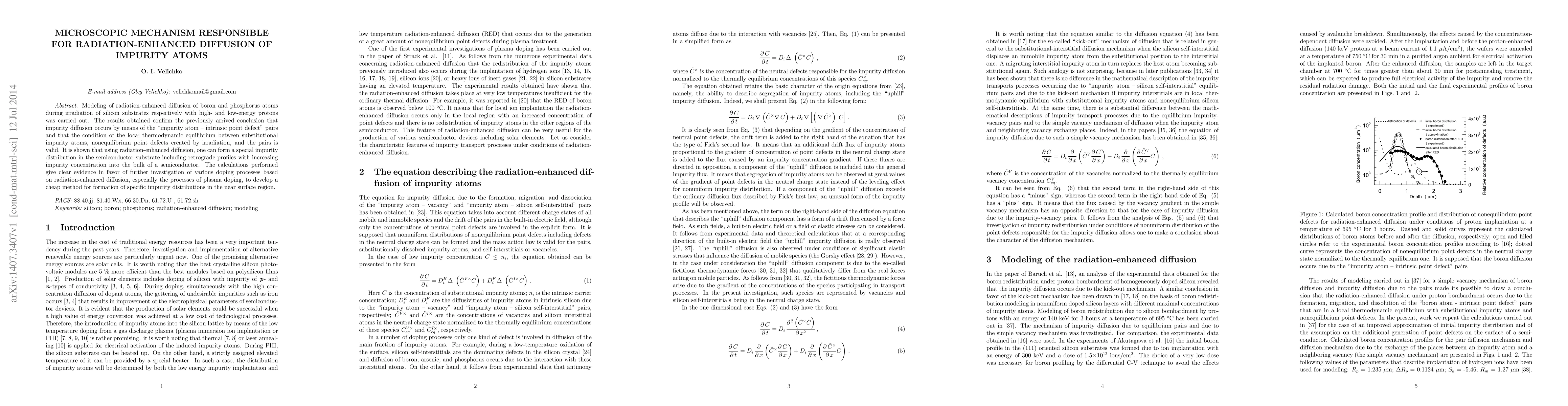 This paper models the radiation-enhanced diffusion of boron and phosphorus in silicon under proton irradiation, confirming that impurity diffusion occurs via "impurity atom-intrinsic point defect" pairs. The study suggests that this method can create specific impurity profiles, including retrograde doping, and recommends further investigation into plasma doping for cost-effective semiconductor doping.