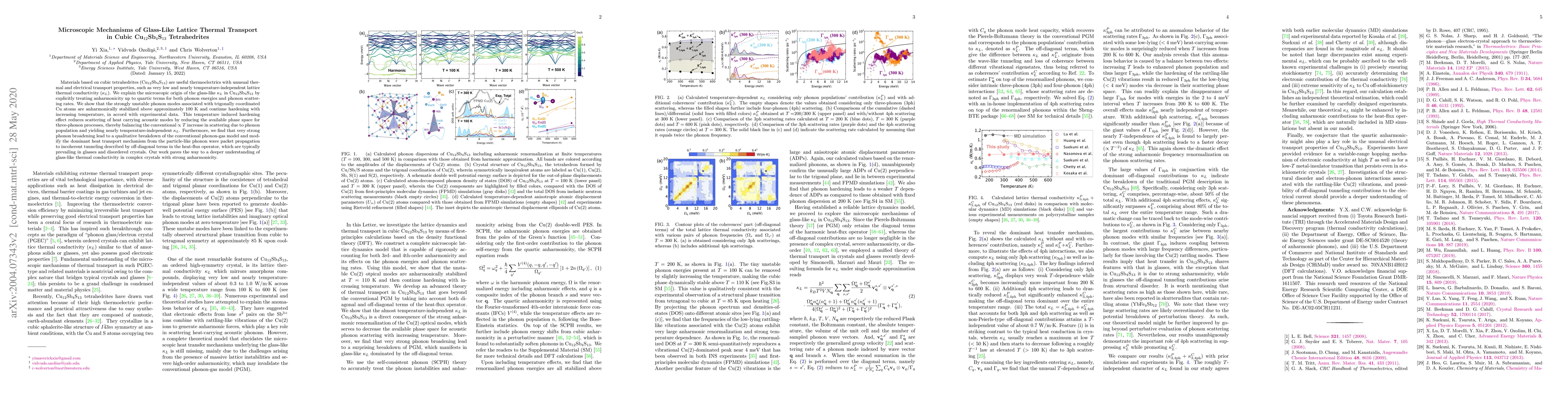 The research explains the unusual low and temperature-independent thermal conductivity in Cu$_{12}$Sb$_{4}$S$_{13}$ tetrahedrites by considering anharmonicity up to quartic terms. It highlights that strongly unstable phonon modes are anharmonically stabilized above 100 K, reducing scattering of heat-carrying acoustic modes and leading to glass-like thermal transport, challenging the conventional phonon-gas model.
