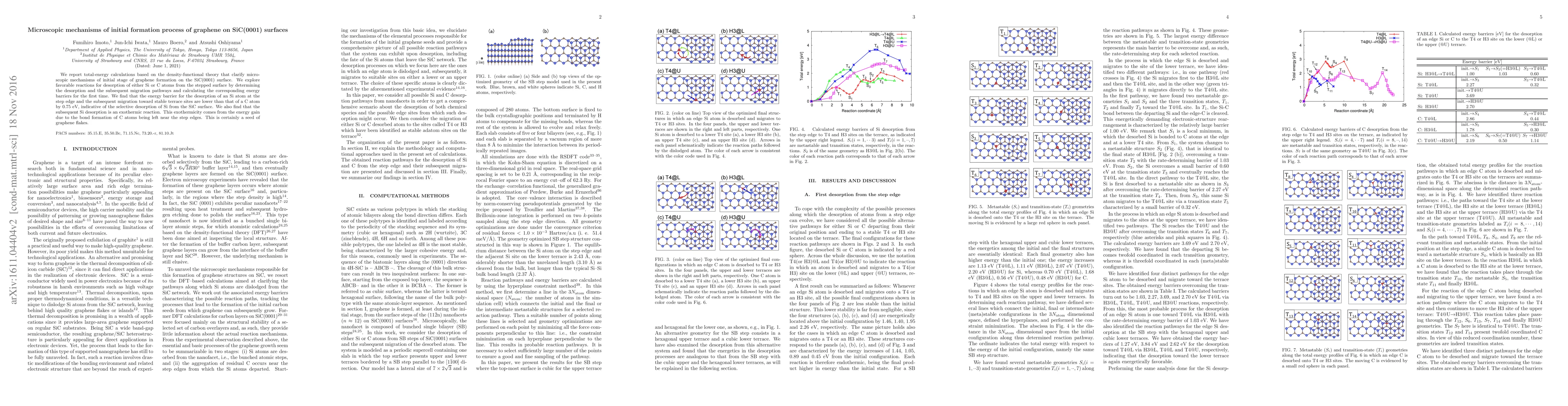 We report total-energy calculations based on the density-functional theory that clarify microscopic mechanisms of initial stage of graphene formation on the SiC(0001) surface. We explore favorable reactions for desorption of either Si or C atoms from the stepped surface by determining the desorption and the subsequent migration pathways and calculating the corresponding energy barriers for the first time. We find that the energy barrier for the desorption of an Si atom at the step edge and the subsequent migration toward stable terrace sites are lower than that of a C atom by 0.75 eV, indicative of the selective desorption of Si from the SiC surface. We also find that the subsequent Si desorption is an exothermic reaction. This exothermicity comes from the energy gain due to the bond formation of C atoms being left near the step edges. This is certainly a seed of graphene flakes.