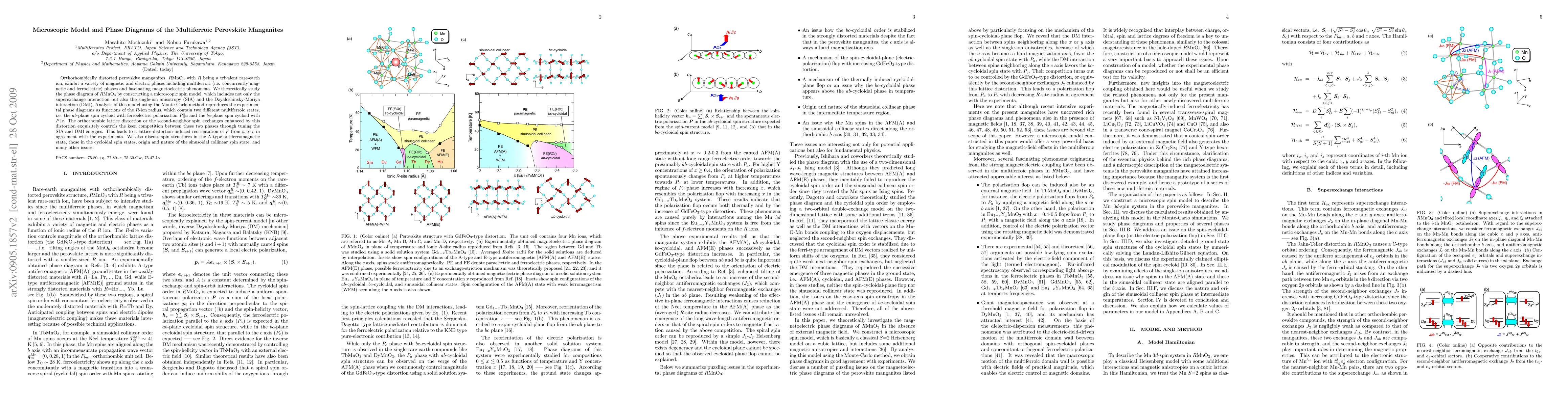 This paper constructs a microscopic spin model for orthorhombically distorted perovskite manganites, RMnO3, to study their phase diagrams. The model, including superexchange, single-ion anisotropy, and Dzyaloshinsky-Moriya interactions, reproduces experimental phase diagrams and reveals two multiferroic states, with the lattice distortion controlling the competition between them.
