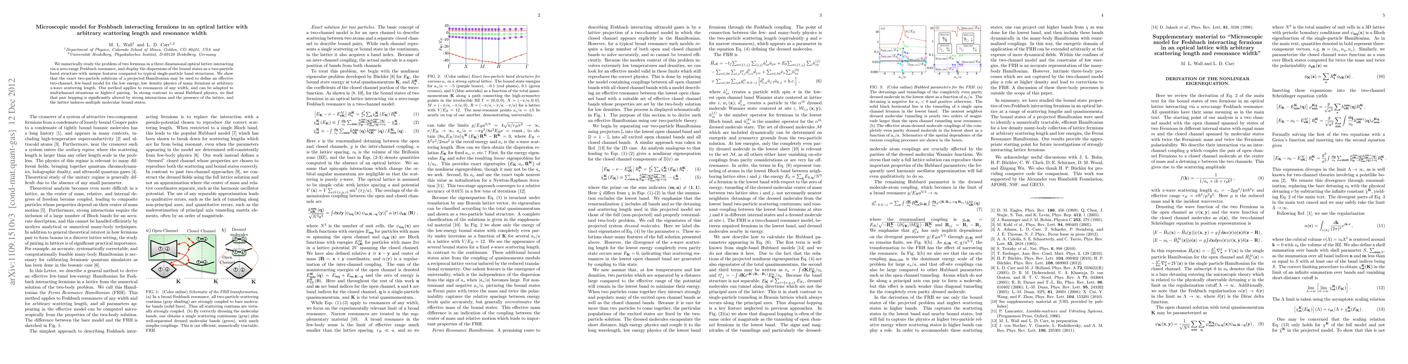 We numerically study the problem of two fermions in a three dimensional optical lattice interacting via a zero-range Feshbach resonance, and display the dispersions of the bound states as a two-particle band structure with unique features compared to typical single-particle band structures. We show that the exact two-particle solutions of a projected Hamiltonian may be used to define an effective two-channel, few-band model for the low energy, low density physics of many fermions at arbitrary s-wave scattering length. Our method applies to resonances of any width, and can be adapted to multichannel situations or higher-$\ell$ pairing. In strong contrast to usual Hubbard physics, we find that pair hopping is significantly altered by strong interactions and the presence of the lattice, and the lattice induces multiple molecular bound states.