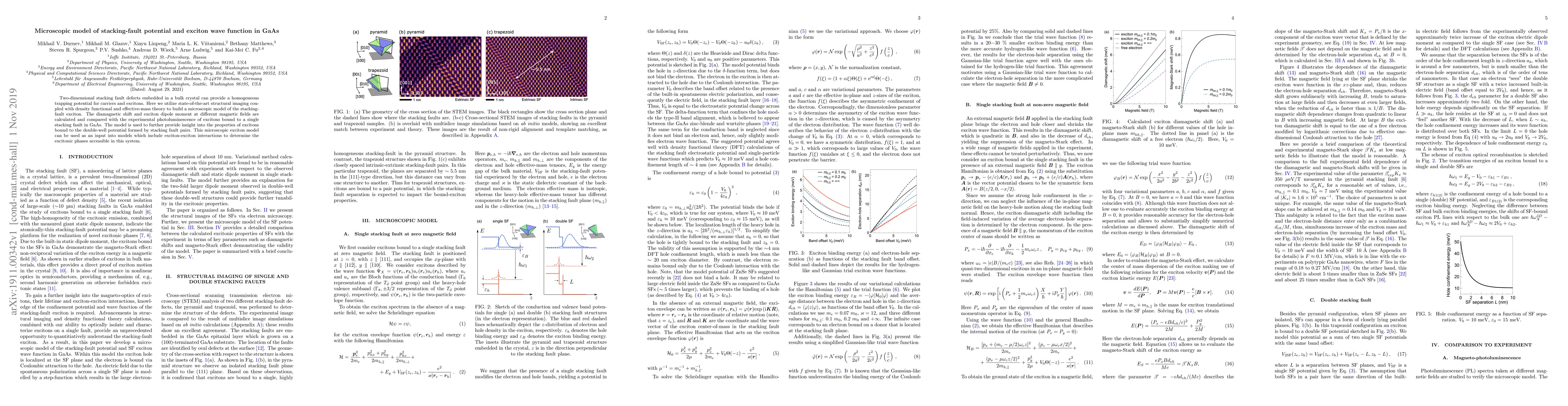 Two-dimensional stacking fault defects embedded in a bulk crystal can provide a homogeneous trapping potential for carriers and excitons. Here we utilize state-of-the-art structural imaging coupled with density functional and effective-mass theory to build a microscopic model of the stacking-fault exciton. The diamagnetic shift and exciton dipole moment at different magnetic fields are calculated and compared with the experimental photoluminescence of excitons bound to a single stacking fault in GaAs. The model is used to further provide insight into the properties of excitons bound to the double-well potential formed by stacking fault pairs. This microscopic exciton model can be used as an input into models which include exciton-exciton interactions to determine the excitonic phases accessible in this system.