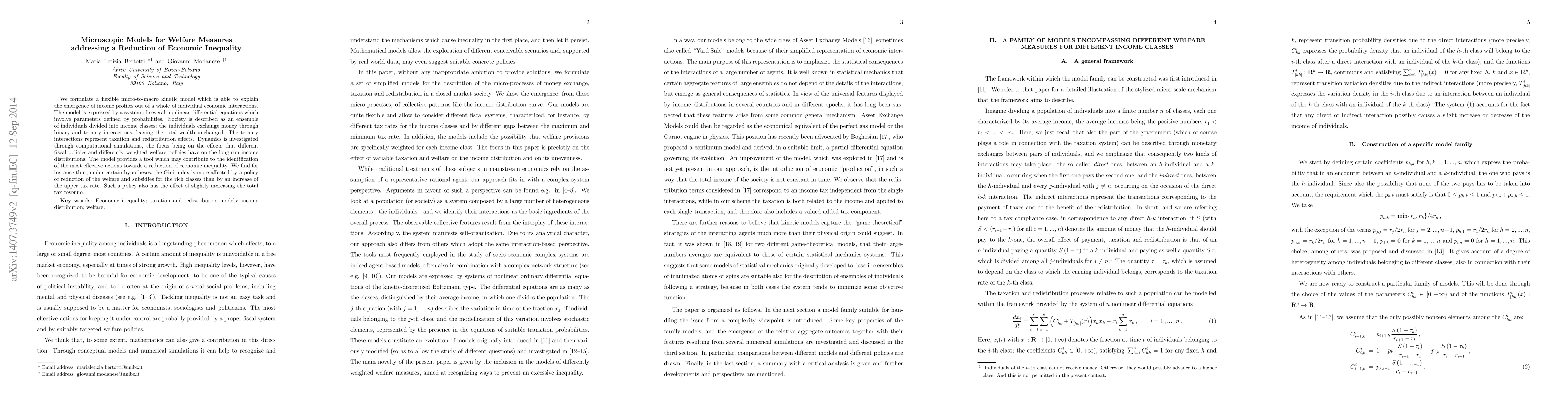 We formulate a flexible micro-to-macro kinetic model which is able to explain the emergence of income profiles out of a whole of individual economic interactions. The model is expressed by a system of several nonlinear differential equations which involve parameters defined by probabilities. Society is described as an ensemble of individuals divided into income classes; the individuals exchange money through binary and ternary interactions, leaving the total wealth unchanged. The ternary interactions represent taxation and redistribution effects. Dynamics is investigated through computational simulations, the focus being on the effects that different fiscal policies and differently weighted welfare policies have on the long-run income distributions. The model provides a tool which may contribute to the identification of the most effective actions towards a reduction of economic inequality. We find for instance that, under certain hypotheses, the Gini index is more affected by a policy of reduction of the welfare and subsidies for the rich classes than by an increase of the upper tax rate. Such a policy also has the effect of slightly increasing the total tax revenue.