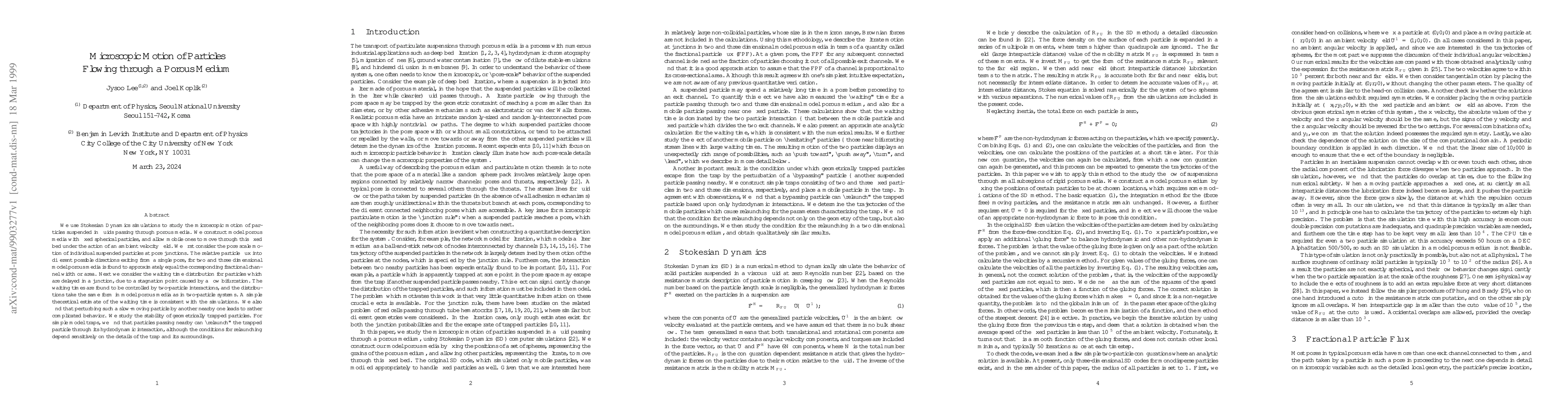 We use Stokesian Dynamics simulations to study the microscopic motion of particles suspended in fluids passing through porous media. We construct model porous media with fixed spherical particles, and allow mobile ones to move through this fixed bed under the action of an ambient velocity field. We first consider the pore scale motion of individual suspended particles at pore junctions. The relative particle flux into different possible directions exiting from a single pore, for two and three dimensional model porous media is found to approximately equal the corresponding fractional channel width or area. Next we consider the waiting time distribution for particles which are delayed in a junction, due to a stagnation point caused by a flow bifurcation. The waiting times are found to be controlled by two-particle interactions, and the distributions take the same form in model porous media as in two-particle systems. A simple theoretical estimate of the waiting time is consistent with the simulations. We also find that perturbing such a slow-moving particle by another nearby one leads to rather complicated behavior. We study the stability of geometrically trapped particles. For simple model traps, we find that particles passing nearby can ``relaunch'' the trapped particle through its hydrodynamic interaction, although the conditions for relaunching depend sensitively on the details of the trap and its surroundings.