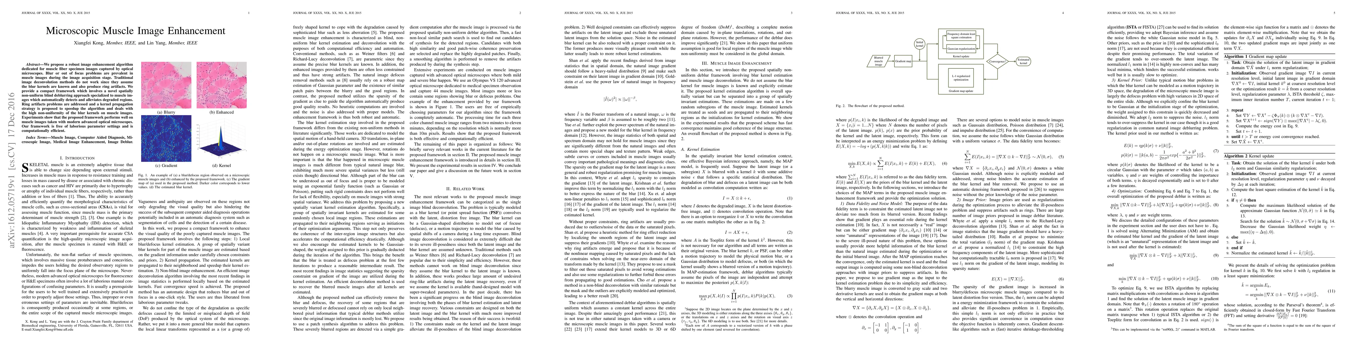 We propose a robust image enhancement algorithm dedicated for muscle fiber specimen images captured by optical microscopes. Blur or out of focus problems are prevalent in muscle images during the image acquisition stage. Traditional image deconvolution methods do not work since they assume the blur kernels are known and also produce ring artifacts. We provide a compact framework which involves a novel spatially non-uniform blind deblurring approach specialized to muscle images which automatically detects and alleviates degraded regions. Ring artifacts problems are addressed and a kernel propagation strategy is proposed to speedup the algorithm and deals with the high non-uniformity of the blur kernels on muscle images. Experiments show that the proposed framework performs well on muscle images taken with modern advanced optical microscopes. Our framework is free of laborious parameter settings and is computationally efficient.