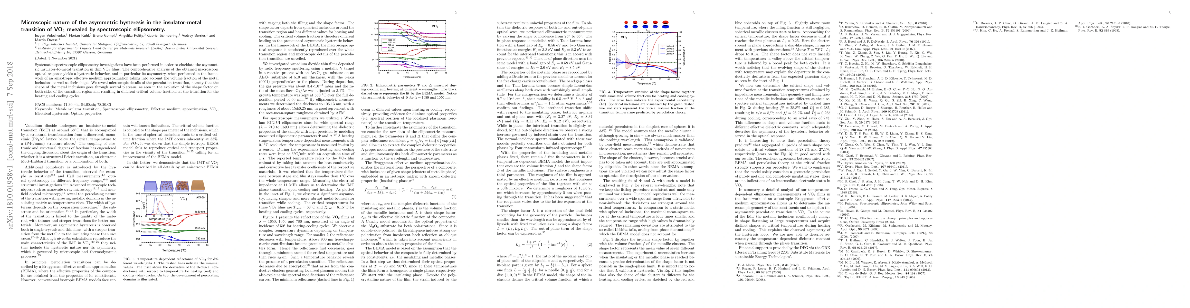 Systematic spectroscopic ellipsometry investigations have been performed in order to elucidate the asymmetric insulator-to-metal transition in thin VO$_2$ films. The comprehensive analysis of the obtained macroscopic optical response yields a hysteretic behavior, and in particular its asymmetry, when performed in the framework of an anisotropic effective medium approximation taking into account the volume fraction of the metal inclusions as well as their shape. We reveal microscopic details of the percolation transition, namely that the shape of the metal inclusions goes through several plateaus, as seen in the evolution of the shape factor on both sides of the transition region and resulting in different critical volume fractions at the transition for the heating and cooling cycles.