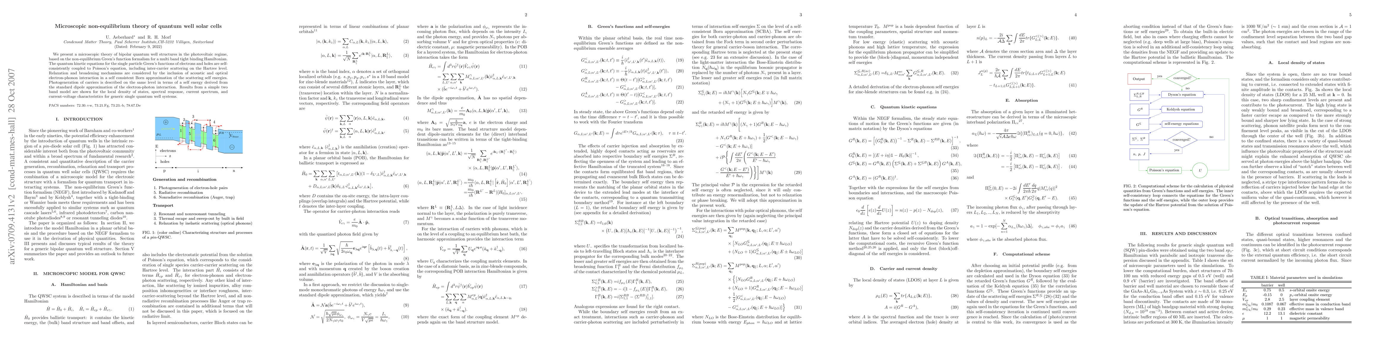 We present a microscopic theory of bipolar quantum well structures in the photovoltaic regime, based on the non-equilibrium Green's function formalism for a multi band tight binding Hamiltonian. The quantum kinetic equations for the single particle Green's functions of electrons and holes are self-consistently coupled to Poisson's equation, including inter-carrier scattering on the Hartree level. Relaxation and broadening mechanisms are considered by the inclusion of acoustic and optical electron-phonon interaction in a self consistent Born approximation of the scattering self energies. Photogeneration of carriers is described on the same level in terms of a self energy derived from the standard dipole approximation of the electron-photon interaction. Results from a simple two band model are shown for the local density of states, spectral response, current spectrum, and current-voltage characteristics for generic single quantum well systems.