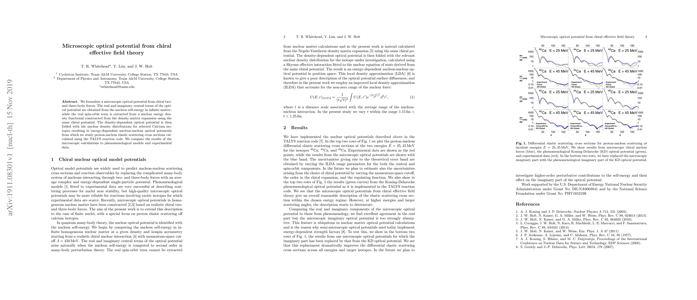 The paper presents a microscopic optical potential derived from chiral effective field theory, including real and imaginary central terms from nucleon self-energy and the real spin-orbit term from a nuclear energy density functional constructed via density matrix expansion using the same chiral potential.