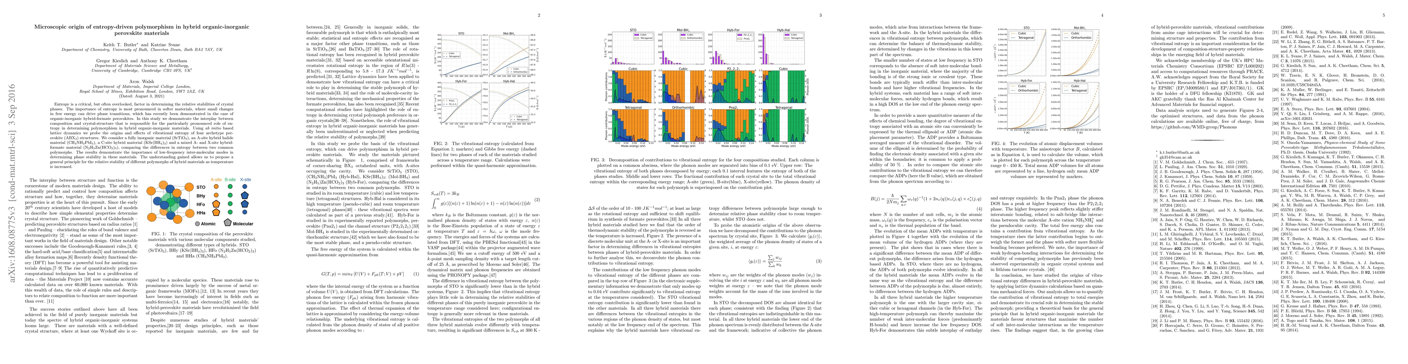 Entropy is a critical, but often overlooked, factor in determining the relative stabilities of crystal phases. The importance of entropy is most pronounced in softer materials, where small changes in free energy can drive phase transitions, which has recently been demonstrated in the case of organic-inorganic hybrid-formate perovskites. In this study we demonstrate the interplay between composition and crystal-structure that is responsible for the particularly pronounced role of entropy in determining polymorphism in hybrid organic-inorganic materials. Using ab initio based lattice dynamics we probe the origins and effects of vibrational entropy of four archetype perovskite (ABX$_3$) structures. We consider a fully inorganic material (SrTiO$_3$), an A-site hybrid halide material (CH$_3$NH$_3$PbI$_3$), an X-site hybrid material (KSr(BH$_4$)$_3$) and a mixed A- and X-site hybrid-formate material (N$_2$H$_5$Zn(HCO$_2$)$_3$), comparing the differences in entropy between two common polymorphs. The results demonstrate the importance of low-frequency inter-molecular modes in determining phase stability in these materials. The understanding gained allows us to propose a general principle for the relative stability of different polymorphs of hybrid materials as temperature is increased.