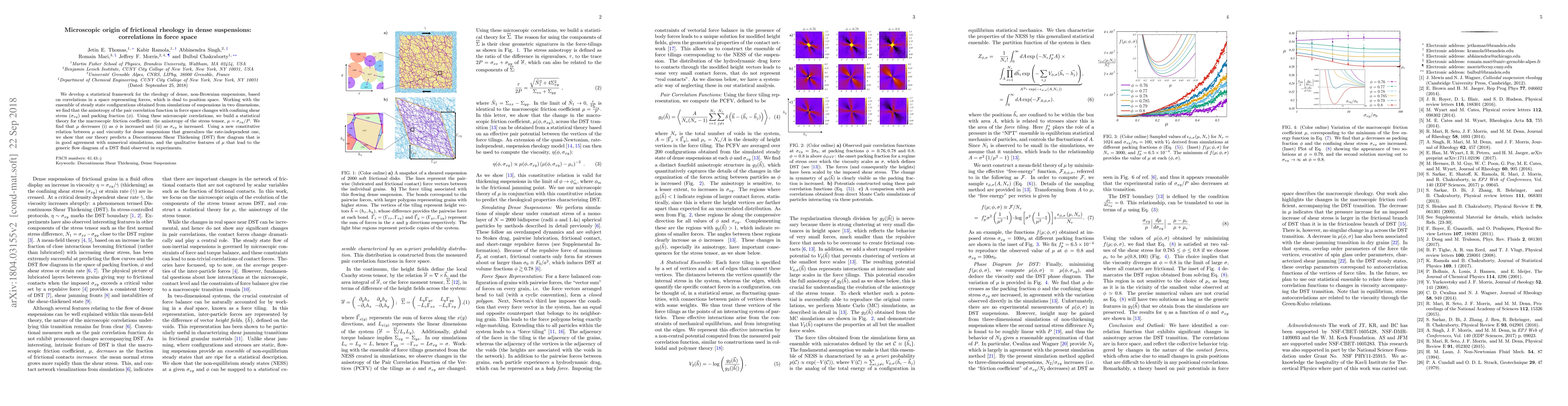 We develop a statistical framework for the rheology of dense, non-Brownian suspensions, based on correlations in a space representing forces, which is dual to position space. Working with the ensemble of steady state configurations obtained from simulations of suspensions in two dimensions, we find that the anisotropy of the pair correlation function in force space changes with confining shear stress ($\sigma_{xy}$) and packing fraction ($\phi$). Using these microscopic correlations, we build a statistical theory for the macroscopic friction coefficient: the anisotropy of the stress tensor, $\mu = \sigma_{xy}/P$. We find that $\mu$ decreases (i) as $\phi$ is increased and (ii) as $\sigma_{xy}$ is increased. Using a new constitutive relation between $\mu$ and viscosity for dense suspensions that generalizes the rate-independent one, we show that our theory predicts a Discontinuous Shear Thickening (DST) flow diagram that is in good agreement with numerical simulations, and the qualitative features of $\mu$ that lead to the generic flow diagram of a DST fluid observed in experiments.